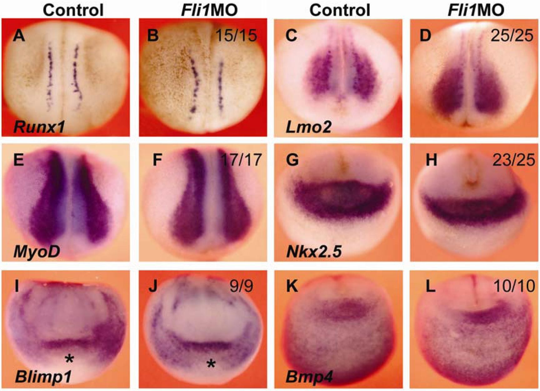 Lmo2 (C,D) was unchanged in Fli1 morphants. MyoD, Nkx2.5, Blimp1 and Bmp4