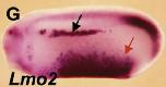 lmo2 (LIM domain only 2 (rhombotin-like 1)) gene expression in Xenopus laevis embryo, NF stage 24, assayed by in situ hybridization, lateral view, anterior left, dorsal up.