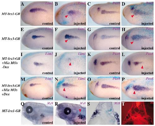 Fig. 4. Overexpression of Irx genes in Xenopus expands the pronephric territory. Embryos are shown in lateral views (except when indicated). Embryos were injected in a single blastomere (V2.2) at the 8- to 16-cell stage and lacZ mRNA was used as linear tracer. Neurula (A-P) or tadpole (Q-R) embryos injected with different mRNAs. Transverse sections of tadpole embryos are shown in S,T. (A-H) Overexpression of 300 pg of MT-Irx1-GR (A-D) or MT-Irx3-GR (E-H) mRNAs expands (arrowheads) ventrally the expression of Lim1 (A,B,E,F) and Pax8 (C,D,G,H) upon addition of dexamethasone (Dex) at stage 14, whereas no effect was observed in the absence of Dex (not shown). (I-P) Embryos co-injected with a mix of Irx1 and Irx3 MOs and MT-Irx3-GR mRNAs show strong downregulation of Lim1 (I,J; arrowhead) and Pax8 (K,L; arrowhead) in the absence of Dex. (M-P) This phenotype is rescued upon addition of hormone at stage 14. (Q-T) Tadpole embryos injected with MT-Irx1-GR mRNAs and Dex treated at stage 14 show enlarged kidneys (Q,R; arrowhead), as determined by staining with the 3G8 antibody. (S) Transverse section of a similarly injected embryo. (T) The same section treated with propidium iodide for nuclear staining. The control and the enlarged pronephros show the same cellular morphology.