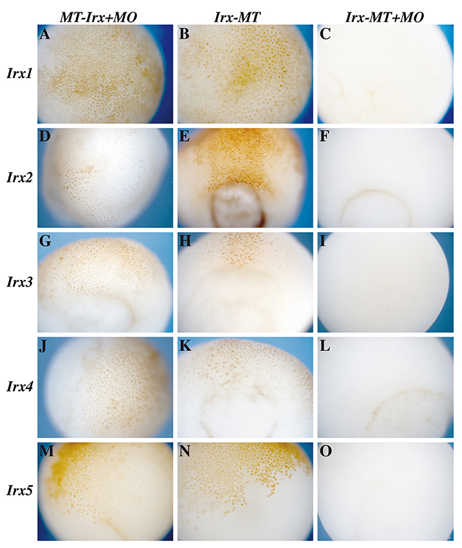 Fig. S2. Specificity of Irx morpholinos. To test the specificity of the morpholinos (MOs), we generated Xenopus laevis Irx constructs bearing a Myc epitope either at the N (MT-Irx) or at the C terminus (Irx-MT). MOs are antisense oligonucleotides that block translation efficiently only if their target sequence is within 25 bases of the translation start site. This is the case for Irx-MT mRNA but not for the MT-Irx transcripts. (A,D,G,J,M) Myc staining of stage 12 embryos injected with 0.5 ng of MT-Irx mRNAs and 10 ng of the corresponding MO. The MOs are unable to block MT-Irx translation. (B,E,H,K,N) Myc staining in stage 12 embryos injected with 0.5 ng of Irx-MT mRNAs. (C,F,I,L,O) Myc staining in stage 12 embryos injected with 0.5 ng of Irx-MT mRNAs and 10 ng of the corresponding MO. Each MO effectively blocks the translation of its corresponding Irx-MT mRNA. The different MOs can only block the translation of their corresponding genes (not shown).