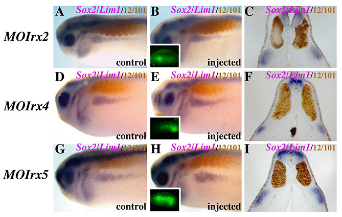 Fig. S3. Irx2, Irx4 and Irx5 are not required for kidney formation. All embryos were injected with specific Irx MOs and GFP mRNA in V2.2 blastomere of 8- to 16-cell stage embryos. Stage 22 embryos injected and triple labelled for Sox2 and Lim1 in purple and 12/101 in brown. (A,D,G) Control uninjected sides. (B,E,H) Morpholino-injected sides. Insets show the GFP distribution in the injected embryos. Impairment of Irx2, Irx4 or Irx5 does not affect Lim1 expression. Transverse sections of injected embryos are shown in C,F,I.