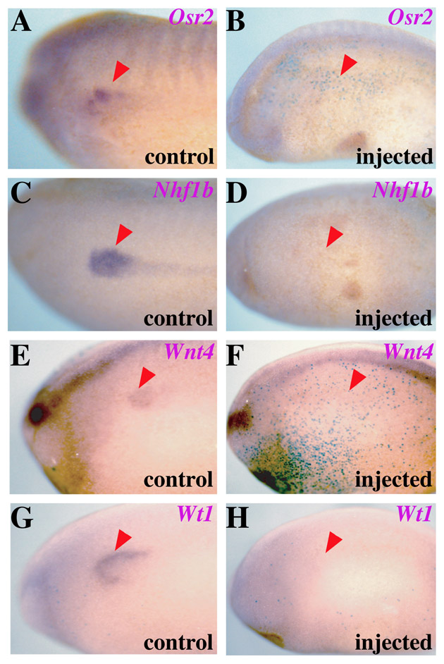Fig. S5. Irx genes are required for maintaining the expression of kidney genes. Embryos injected with a mix of Irx1 and Irx3 MOs were assayed for the expression of different kidney genes at early late neurula-early tailbud stages. (A,C,E,G) Control uninjected sides. (B,D,F,H) Depletion of Irx activity downregulates the expression of Osr2 (B), Nhf1β (D), Wnt4 (F) and Wt1 (H)
