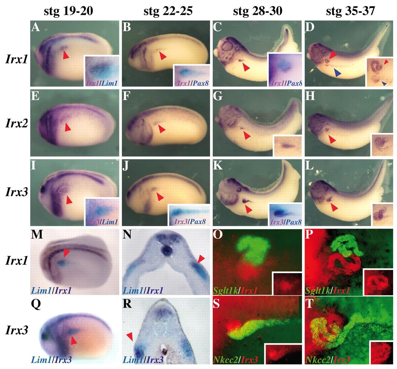 Fig. 1. Expression patterns of Xenopus laevis Irx genes during pronephros development. Embryos are shown in lateral views (except when indicated); red arrowheads indicate the kidney territory. (A-D) Expression pattern of Irx1 at indicated developmental stages. At mid-(A) or late (B) neurula, Irx1 is detected in the dorsal pronephric territory. Insets show pronephric territory of an embryo double-stained for Lim1 or Pax8 (blue) and Irx1 (purple). Irx1 expression is restricted dorsally. During tailbud (C) or tadpole (D) stages, Irx1 expression shifts to a more ventral region that will form the intermediate tubule. Inset in C indicates an embryo double-stained for Pax8 (blue) and Irx1 (purple). Note the ventral position of Irx1 in the future intermediate tubule. Inset in D indicates a higher magnification of the pronephric Irx1 territory. Note the expression of Irx1 in the migrating ventral mesoderm (blue arrowheads). (E-H) Irx2 shows an expression pattern similar to that of Irx1, although it is not expressed in ventral migrating mesoderm. (I-L) Spatial distribution of Irx3 mRNA. (I) At mid-neurula, Irx3 mRNA is detected in a broad domain that contains most of the pronephric territory. Inset indicates pronephric territory of an embryo double-stained for Lim1 (blue) and Irx3 (purple). (J) At late neurula/early tailbud stages, Irx3 becomes restricted to the ventral pronephric territory. Inset indicates Irx3 ventral restriction in an embryo co-stained for Pax8 (blue). (K,L) From tailbud stages, Irx3 expression is detected in the intermediate tubule. Inset in K indicates embryo double-stained for Pax8 (blue) and Irx3 (purple). Inset in L indicates high magnification of the pronephric Irx3 territory. (M,N) Lateral view (M) and transverse section (N) of late neurula embryos showing Lim1 (blue) and Irx1 (purple) expression. Irx1 expression is restricted to the dorsal pronephric anlage. (O,P) Double staining for Sglt1k (green) and Irx1 (red) in tailbud (O) or tadpole (P) embryos. Insets indicate single Irx1 red channel. The Irx1 expression domain is located just distal to that of Sglt1k. (Q,R) Lateral view (Q) and transverse section (R) of late neurula embryos showing Lim1 (blue) and Irx3 (purple) expression. There is initial broad expression of Irx3 in most of the pronephric anlage (Q) and a later restriction to the ventral pronephros (R). (S,T) Double staining for Nkcc2 (green) and Irx3 (red) in tailbud (S) or tadpole (T) embryos. Insets show single Irx3 red channel. The expression domains of both genes largely overlap, but the Irx3 domain extends proximally into the proximal tubule, whereas Nkcc2 extends distally into the distal tubule.