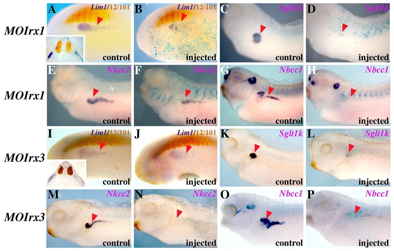 Fig. 2. Irx1 and Irx3 are necessary for kidney formation in Xenopus. Embryos are shown in lateral views; red arrowheads indicate the kidney territory. Embryos were injected in a single blastomere (V2.2) at the 8- to 16-cell stage and lacZ mRNA was used as linear tracer. Control and injected sides of the same embryo are shown, respectively, of the same specimen. The gene examined in each condition is indicated in the right upper corner of the panels in all figures. (A-H) Embryos injected with MOIrx1 showed reduced Lim1 expression at late neurula (A,B) and downregulation of Sglt1k (C,D), Nkcc2 (E,F) and Nbcc1 (G,H) expression at tadpole stages. Inset in (A) indicates a transverse section of the embryo shown in the major panel. (I-P) Similar results were found upon MOIrx3 injection.