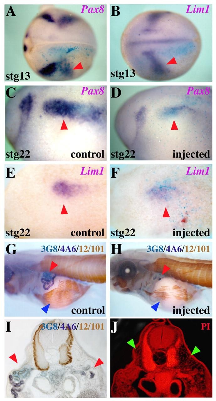 Fig. 3. Irx genes are not required for the initial activation of the early kidney genes. Embryos are shown in lateral views (except A and B, which are dorsal views); red arrowheads indicate the kidney territory. Embryos were injected in a single blastomere (V2.2) at the 8- to 16-cell stage. Xenopus embryos injected with a mix of Irx1 and Irx3 MOs and lacZ mRNA were assayed for the expression of Pax8 and Lim1 genes at early (A,B) or late (C-F) neurula stages. (A,B) Impairment of Irx gene function does not affect early expression of Pax8 (A) or Lim1 (B). (C-F) By contrast, depletion of Irx activity downregulates the expression of these genes at late neurula stage. (G,H) Tadpole embryos injected with Irx1 and Irx3 MOs and triple labelled for muscle (12/101, brown), pronephric tubules (3G8, blue) and duct (4A6, purple). The injected side (H) shows strong impairment of kidney tissue (red arrowheads) and reduced number of ventral muscle fibres (blue arrowheads) when compared with the control side (G). (I) Transverse section of the embryo shown in H. (J) The same section after treatment with propidium iodide. An increased number of fibroblast-like cells in the injected right side compared with the control left side (arrowheads).
