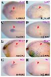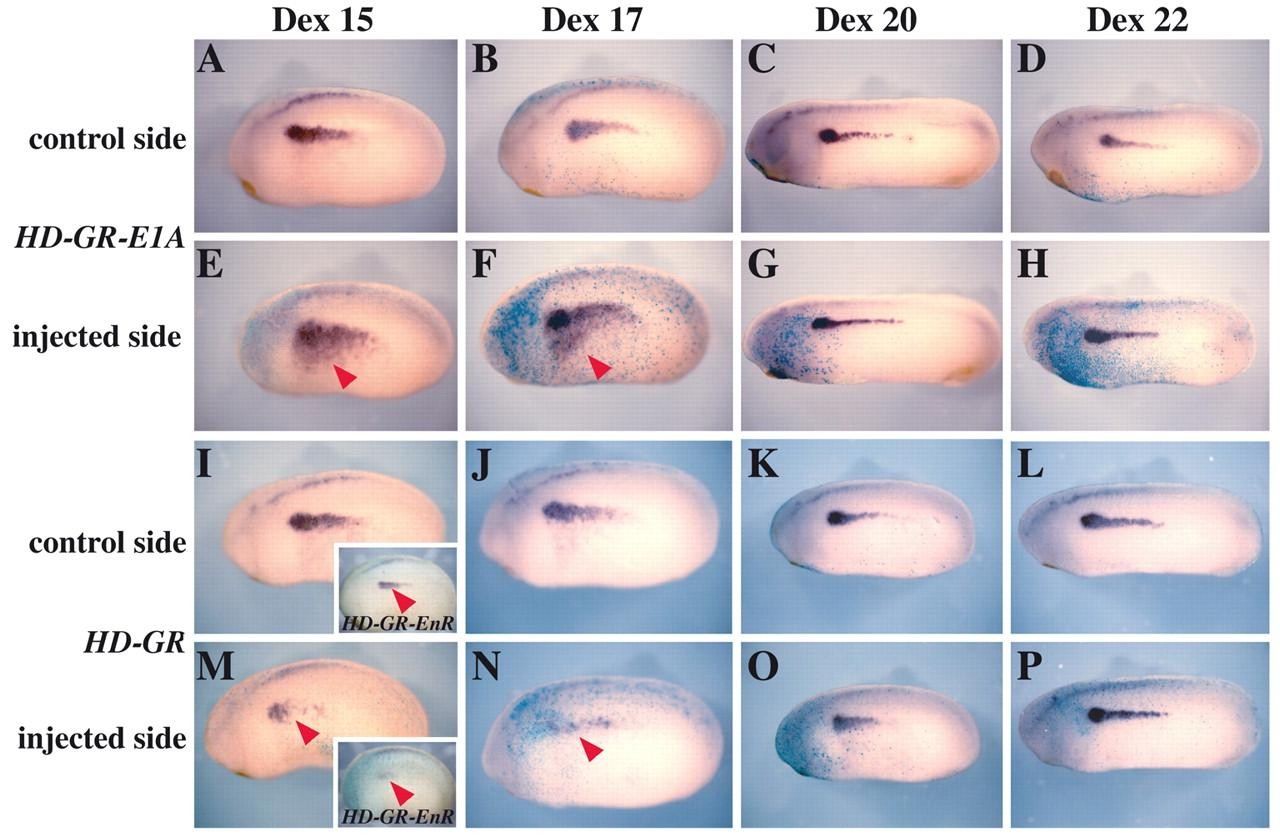 Fig. 5. Early Irx gene requirement for pronephros development occurs at neurula stages. Embryos are shown in lateral views. Embryos were injected in a single blastomere (V2.2) at the 8- to 16-cell stage and lacZ mRNA was used as linear tracer. Late neurula-early tailbud Xenopus embryos co-injected with 500 pg of HD-E1A-GR (A-H), HD-GR (I-P) or HD-EnR-GR (I,M, inset) mRNAs and assayed for expression of Lim1. (A-H) Embryos injected with a hormone-inducible activating form of Irx (HD-E1A-GR) show expanded Lim1 only when Dex was added during mid neurula stages (arrowheads). (I-P) Embryos injected with a hormone-inducible dominant negative (HD-GR) form of Irx show reduced Lim1 expression only when Dex was added during mid neurula stages (arrowheads). The same results were found with a hormone-inducible repressing form of Irx (HD-EnR-GR) (I and M, inset and not shown).
