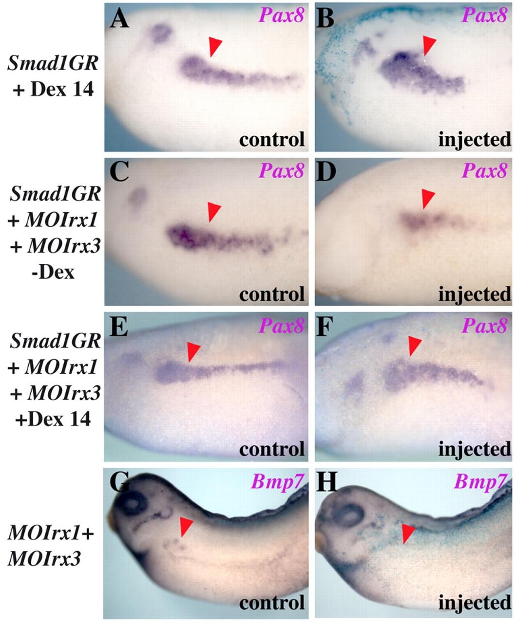 Fig. 6. Irx gene loss of function kidney defects are partially rescued by increased Smad1 activity in Xenopus. Embryos are shown in lateral views and red arrowheads indicate the kidney territory. Embryos were injected in a single blastomere (V2.2) at the 8- to 16-cell stage and lacZ mRNA was used as linear tracer. (A,B) Injection of 500 pg of Smad1GR mRNA, upon addition of dexamethasone (Dex) at stage 14, expanded Pax8 expression. No effect was observed in the absence of hormone (not shown). (C-F) In embryos co-injected with 500 pg of Smad1GR mRNA and 4 ng of each Irx1 and Irx3 MOs Pax8 expression was downregulated (C,D) or rescued (E,F) in the absence or presence of Dex, respectively. (G,H) Depletion of Irx1 and Irx3 impaired Bmp7 expression.