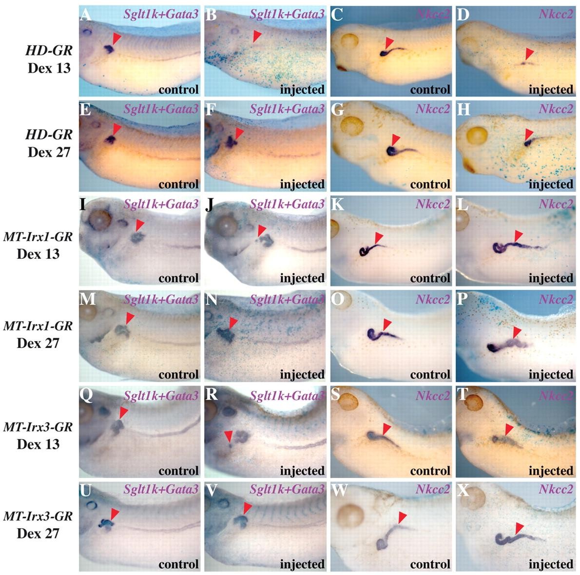 Fig. 8. Temporal requirement for Irx function during proximal-distal pronephric patterning. Embryos are shown in lateral views and red arrowheads indicate the kidney territory. Embryos were injected in a single blastomere (V2.2) at the 8- to 16-cell stage and lacZ mRNA was used as linear tracer. (A-H) Xenopus embryos injected with HD-GR mRNA. (A-D) Impairment of Irx activity during neurula stages downregulated Sglt1k, Gata3 (A,B) and Nkcc2 (C,D) expression. (E-H) Impairment of Irx activity during tailbud stages did not affect Sglt1k or Gata3 (E,F) but reduced Nkcc2 (G,H) expression. (I-P) Embryos injected with MT-Irx1-GR mRNA. (I-L) Increasing Irx1 function during neurula caused ectopic, patched Sglt1k (I,J) and enlarged Nkcc2 expression domains (K,L). No effect was observed on the duct marker Gata3 (I,J). (M-P) Increasing Irx1 function during tailbud did not affect Sglt1k or Gata3 (M,N) but enlarged Nkcc2 (O,P) expression. (Q-X) Similar results were found in embryos injected with MT-Irx3-GR mRNA.