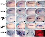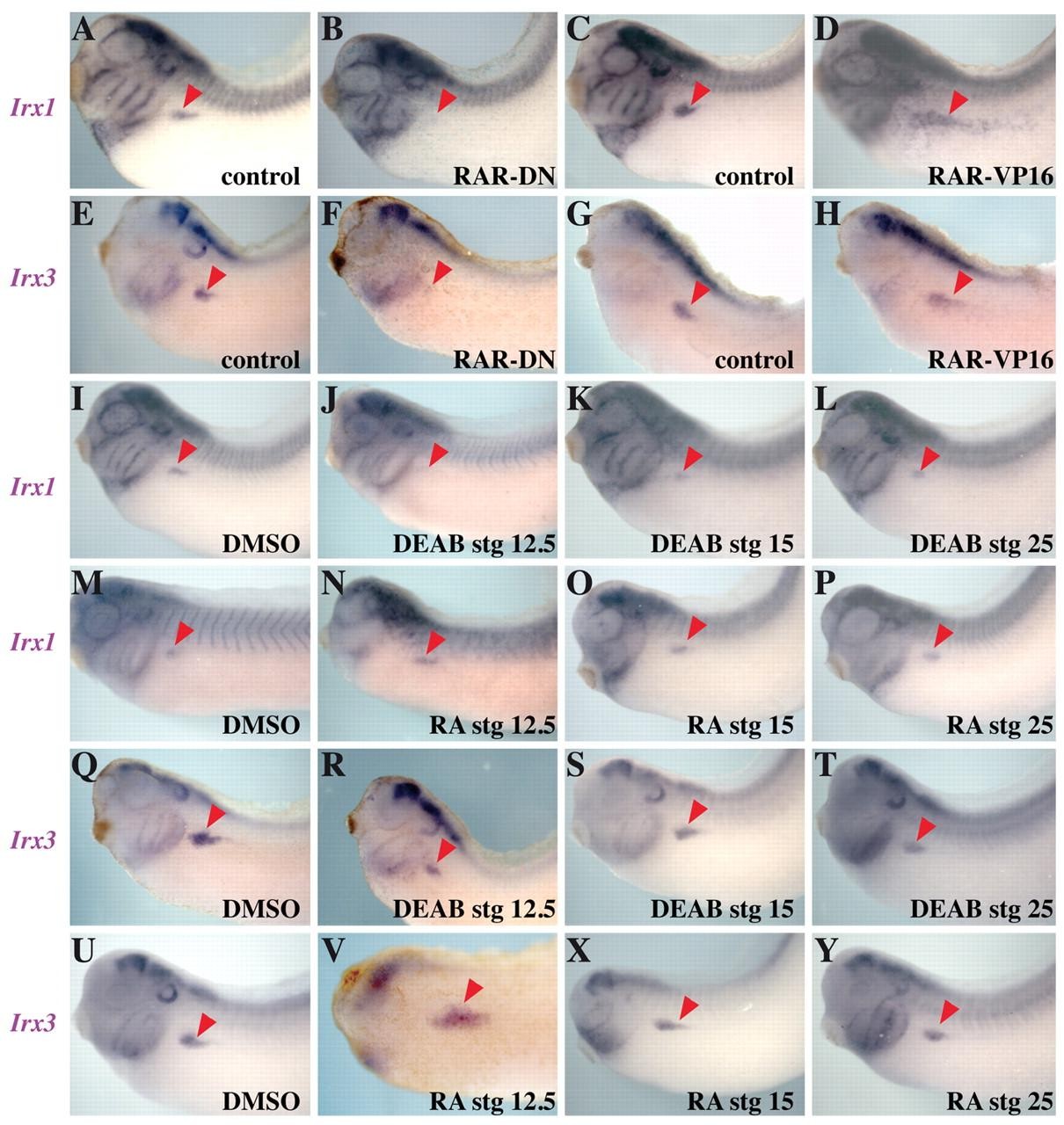 Fig. 9. Irx1 and Irx3 are positively regulated by retinoic acid signalling. Embryos are shown in lateral views and red arrowheads indicate the kidney territory. Embryos were injected in a single blastomere (V2.2) at the 8- to 16-cell stage and lacZ mRNA was used as linear tracer. All panels show Xenopus tadpole embryos. (A,B,E,F) Embryos injected with a dominant negative RA receptor mRNA (RAR-DN) showed impaired Irx1 (A,B) and Irx3 (E,F) expression. (C,D,G,H). Embryos injected with a constitutive RA receptor mRNA (RAR-VP16) showed a strong expansion of Irx1 (C,D) and Irx3 (G,H) expression. (I-Y) Embryos treated at different developmental stages (as indicated) with DMSO (I,M,Q,U), with the inhibitor of RA signalling pathway DEAB (J-L,R-T) or with RA (N-P,V-Y), and analyzed for Irx1 (I-P) or Irx3 (Q-Y) expression. Both genes negatively or positively responded to DEAB (J,R) or RA (N,V), respectively, only when the drugs were added at stage 12.5.