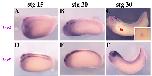 Fig. S1. Irx4 and Irx5 expression pattern in Xenopus. Lateral views of Xenopus embryos at different developmental stages, as indicated. (A-C) Irx4 expression is detected in the pronephros at stage 30. Inset in C show a detail of this expression. (D-F) No expression of Irx5 is observed in the pronephros at these stages.