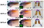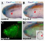 Fig. S4. Transplanted Irx morphant tissue showed impaired pronephros, but not muscle or neural tissue, development. The same embryo, stained for markers for pronephros (Lim1, purple), neural tissue (Sox2, blue) and somatic muscles (12/101, brown) is shown in all panels. (A) Control side showed normal Lim1 expression (arrowhead). (B) The transplanted Irx1 and Irx3 morphant tissue, outlined in red, showed reduced Lim1 expression (arrowhead). No effect was observed in muscles or neuroectoderm. (C) GFP localization on the side containing the transplanted tissue. (D) Overlay of B and C showing the extent of the transplanted area. Inset in D shows a transversal section of this embryo. Lim1 (arrowhead), but not Sox2 or 12/101, levels are reduced in the transplanted side.