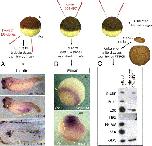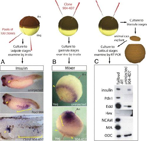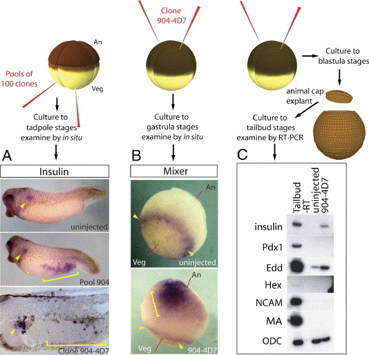 Fig. 1. Expression cloning of novel inducers of pancreatic fate. (A) Pools of 100 RNAs from a gastrula-stage cDNA library were injected into vegetal blastomeres of eight-cell stage Xenopus embryos. Tadpole stage embryos were hybridized to an antisense insulin probe. Whole-mount in situ hybridization using antisense insulin probe, top to bottom: uninjected embryo; embryo injected with 1 ng of 904 pool RNA; vibratome section of embryo injected with the single clone 904-4 D7 RNA. Arrowheads indicate endogenous insulin staining; brackets indicate ectopic insulin expression. An indicates animal pole; Veg indicates vegetal pole. (B) Gastrula stage embryo injected animally with 904-4 D7 and hybridized to an antisense mixer probe. Arrowheads indicate endogenous mixer staining; bracket indicates ectopic mixer expression in the ectoderm. An indicates animal pole; Veg indicates vegetal pole. (C) RT-PCR analysis of animal caps injected with 1 ng 904-4 D7 RNA and cultured until stage 32 (tailbud). Muscle Actin (MA) was used as marker of mesodermal cells at tailbud stage. ODC was used as a loading control for RT-PCR.