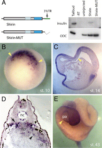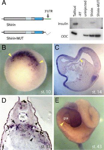 Fig. 2. Shirin insulin-inducing activity is mapped to its 3â²UTR sequence. (A) On the left, schematic representation of Shirin full-length, showing the RhoGAP (light blue) and START (dark blue) domains. The last 400 nucleotides (nt) corresponding to the clone 904-4 D7 (referred to as Shirin 3â²UTR) are in green. On the right, animal caps injected with 60 pg of Shirin RNA and Shirin-MUT RNA, which lacks the 3â²UTR, at the two-cell stage and analyzed for the expression of insulin by RT-PCR at stage 32 (tailbud). (BâE) Shirin mRNA distribution during embryogenesis. (B) At gastrula stage, Shirin is detected at high level in dorsal vegetal cells by whole-mount in situ hybridization. Arrowheads indicate the dorsal lip. (C) Vibratome section of whole-mount in situ hybridization of embryo at neurula stage. Arrowhead indicates the expression of Shirin in the middle dorsal portion of the archenteron roof. (D) Shirin expression in a transverse section of a stage 33 tadpole. Arrow marks expression in dorsal mesodermal layer. Expression within endodermal cells is shown by a arrowhead. (E) At late tadpole stage, the expression of Shirin is confined to the pancreaticâduodenal region of Xenopus gut. Abbreviations: dp, dorsal pancreatic rudiment; nc, notochord; nt, neural tube; pa, pancreas.