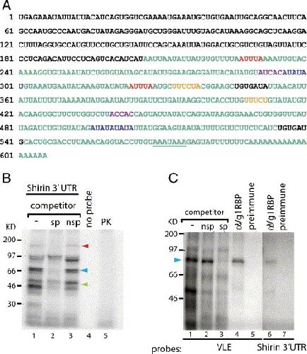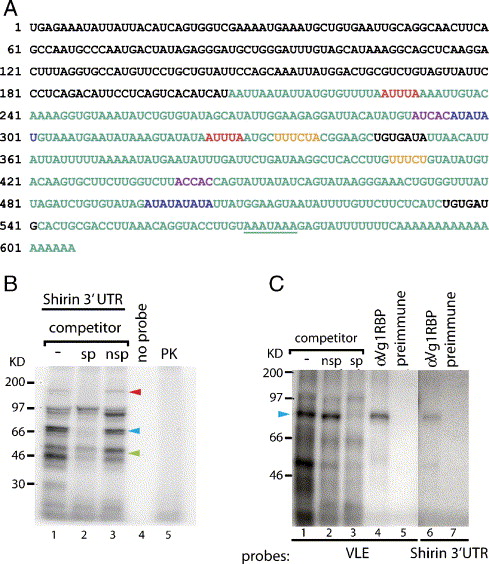 Fig. 3. Analysis of the Shirin 3â²UTR sequence. (A) Nucleotide sequence of the entire 3â²UTR of Shirin. The last 400 nt corresponding to the clone 904-4 D7 (referred to as Shirin 3â²UTR) are in green in the figure. Predicted sequence features present in Shirin 3â²UTR: two potential ARE motifs (red in the figure); two EDEN motifs (blue in the figure); two K-box sequence motifs (black in the figure); two Vg1 motif 1 (VM1; orange in the figure); and two E2 motifs (purple in the figure). Underlined sequence indicates the polyA signal. (B) UV cross-linking assay using 32P-Shirin 3â²UTR RNA as probe and Xenopus embryo extracts at tadpole stage. In the absence of competitor RNA (lane 1). Competitions were carried out with 100-fold excess of either specific competitor (sp, unlabeled Shirin 3â²UTR; lane 2) or non-specific competitor (nsp, polylinker of MT-pCS2+; lane 3). As control, the reaction was performed in the absence of probe (lane 4). Proteinase K digestion of the complexes indicated that the binding factors were proteins (lane 5). Colored arrowheads indicate three major cross-linked proteic complexes. (C) UV cross-linking and immunoprecipitation assay. As positive control, 32P-VLE (for Vg1 Localization Element) was used as probe (lanes 1â5), and for the immunoprecipitation assay, the anti-Vg1RBP antibody and rabbit pre-immune serum, as negative control; 32P-Shirin 3â²UTR RNA as probe (lanes 6â7), and for the immunoprecipitation assay, the anti-Vg1RBP antibody and rabbit pre-immune serum, as negative control. Competitions were carried out with 100-fold excess of either non-specific competitor (nsp, polylinker of MT-pCS2+) or specific competitor (sp, unlabeled specific RNA probes). Vg1RBP is indicated by the blue arrowhead.