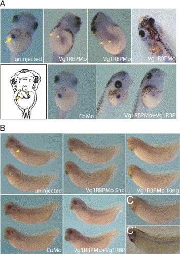 Fig. 5. Vg1RBP is required for pancreas formation. (A) Whole-mount in situ hybridization using antisense insulin probe in embryos, stage 43. Ventral views. Top panel, left to right: uninjected embryo, arrow indicates insulin expression in the pancreas; two embryos injected with 10 ng of Vg1RBPMo, arrowheads indicate defects in gut coiling and looping on the right side of the gut; dorsal view of an embryo injected with 10 ng of Vg1RBPMo shows no phenotypic abnormalities, suggesting that the effects of Vg1RBPMo are specific to the developing gut. Bottom panel, left to right: schematic representation of the gut of stage 43 embryo, arrowheads indicate the first loop of the small intestine posterior to the stomach; embryos injected with 10 ng Control Morpholino oligonucleotide (CoMo) ; coinjection of Vg1RBPMo with 0.5 ng Vg1RBP RNA rescues coiling of the anterior portion of the gut and expression of insulin in the pancreas. (B) Whole-mount in situ hybridization for insulin in embryos, stage 33. Top, left to right: uninjected embryos, arrowhead indicates insulin expression in the dorsal pancreatic bud; embryos injected with either 5 or 10 ng of Vg1RBPMo, as indicated. Bottom, left to right: embryos injected with 10 ng CoMo; coinjection of Vg1RBPMo with 0.5 ng Vg1RBP RNA rescues normal expression of insulin in the dorsal pancreatic rudiment. (C, C′) Higher magnification of one of the 10 ng Vg1RBPMo-injected embryos in (B). Clearing in Benzyl benzoate/Benzyl alcohol (C′) confirmed the absence of insulin-staining cells.