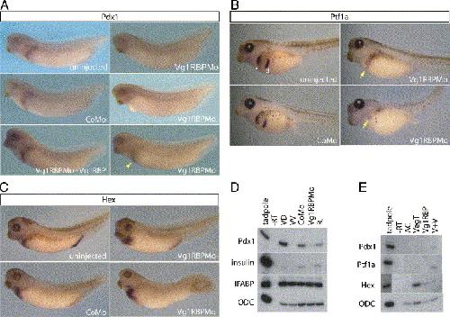 Fig. 6. Specific effect of Vg1RBP depletion on early pancreatic markers. (A) In situ hybridization for Pdx1 in embryos, stage 33. Left panel: uninjected and CoMo-injected embryo (injected with 10 ng CoMo) show expression of Pdx1 as a narrow band in the pancreatic/duodenum endoderm. Right panel, top to bottom: embryos injected with 10 ng of Vg1RBPMo. Coinjection of Vg1RBPMo with 0.5 ng Vg1RBP RNA rescues normal expression of Pdx1. Arrowhead indicates residual Pdx1 staining in the ventral pancreatic bud. (B) In situ hybridization for Ptf1a in embryos, stage 39/40. Left, top to bottom: uninjected embryo shows expression of Ptf1a in both dorsal (d) and ventral (v) pancreatic buds; embryos injected with 10 ng CoMo. Right panel: embryos injected with 10 ng of Vg1RBPMo. Arrows indicate residual Ptf1a staining in the ventral pancreatic bud. (C) In situ hybridization for Hex in embryos, stage 37. Left, top to bottom: uninjected embryo shows expression in the endoderm of the liver diverticulum; embryos injected with 10 ng CoMo. Right panel: embryos injected with 10 ng of Vg1RBPMo. (D) Dorsal vegetal blastomeres injected with 10 ng CoMo, 10 ng Vg1RBPMo, and 10 ng Vg1RBPMo + 0.5 ng Vg1RBP RNA (indicated as R. for rescue) were dissected at early gastrula stage. Uninjected dorsal vegetal (VD) and ventral vegetal (VV) pole halves were used as control, for their regional differences in the expression of endodermal markers (expression of Pdx1 and insulin is confined to VD; IFABP is expressed in both VV and VD) (Henry et al., 1996). All samples were collected at stage 34 (tadpole) and assayed by RT-PCR analysis for markers of pancreatic specification (Pdx1 and insulin) and intermediate-posterior endoderm (IFABP). (E) Animal caps injected with 60 pg VegT RNA and/or 0.5 ng Vg1RBP RNA, as indicated. Coinjection of VegT + Vg1RBP is indicated as V + V. The explants were cultured until stage 34 (tadpole) and analyzed for expression of late endodermal markers by RT-PCR.