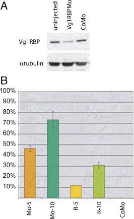 Supplementary Fig. S4. Vg1RBP translation is specifically inhibited in vivo by Vg1RBPMo injection. (A) Uninjected embryos, injected embryos with either Vg1RBPMo, or CoMo into the vegetal pole were harvested at tadpole stage and processed for Western blot analysis of Vg1RBP and α-tubulin. Vg1RBP levels were reduced to 20% of original levels in the Vg1RBPMo-injected embryos compared to both uninjected and CoMo-injected embryos, as already described by (Yaniv et al., 2003). (B) Vg1RBPMo acts specifically. The percentage of embryos showing pancreatic phenotype (reduction of Pdx1 and insulin expression) following injection of 5 ng (Mo-5) and 10 ng (Mo-10) of Vg1RBPMo, and 10 ng of CoMo is illustrated. The phenotype is highly penetrant, with more than 70% of the antisense-injected embryos showing a pancreatic phenotype. Coinjection of 0.5 ng of sense Vg1RBP RNA with Vg1RBPMo (Vg1RBPMo 5 ng = R-5; Vg1RBPMo 10 ng = R-10) results in rescue of the mutant phenotype. Standard deviation was calculated from three independent experiments.