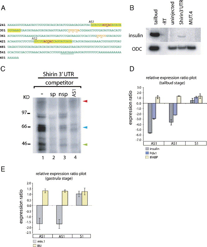 Fig. 4. Disruption of the Shirin 3â²UTR and Vg1RBP RNAâprotein interaction results in loss of Shirin insulin-inducing activity. (A) Nucleotide sequence of Shirin 3â²UTR from nt 241 to nt 606, showing two VM1 (orange in the figure) and two E2 motifs (purple in the figure). Underlined sequences indicate single nucleotide substitutions within the VM1 (UâG) and E2 (CâG) motifs. Sequences highlighted in yellow correspond to the sequences targeted by the 2â²-O-Me antisense oligoribonucleotides (AS1 and AS2). Sense oligoribonucleotides were used as control. (B) Mutational analysis of Vg1RBP-binding motifs in the Shirin 3â²UTR sequence. Animal caps injected with 1 ng of wild-type Shirin 3â²UTR and mutated Shirin 3â²UTR, bearing point mutations in all the four Vg1RBP-binding sites (indicated as MUT. 4), at the two-cell stage and analyzed for the expression of insulin by RT-PCR at stage 32 (tailbud). (C) UV cross-linking assay using 32P-Shirin 3â²UTR RNA as probe and Xenopus embryo extracts at tadpole stage. In the absence of competitor RNA (lane 1). Competitions were carried out with 100-fold excess of specific competitor (sp, unlabeled Shirin 3â²UTR; lane 2), non-specific competitor (nsp, polylinker of MT-pCS2+; lane 3), 10 μM AS1 (lane 4). Colored arrowheads indicate three major cross-linked proteic complexes. (D) Real-time RT-PCR analysis of Xenopus embryos injected with 2â²-O-Me antisense oligoribonucleotides. Two-cell stage embryos injected with 10 μM oligoribonucleotides (AS1 and S1) into the vegetal pole were analyzed for the expression of insulin, Pdx1, and IFABP by quantitative real-time RT-PCR at stage 32 (tailbud). The plot shows the regulation (expression ratio) of the target genes in injected embryos versus uninjected embryos (the control group). All the values were normalized to the reference gene, ODC, and calculated using the software REST© (Relative Expression Software Tool) (Pfaffl et al., 2002). In embryos injected with sense oligoribonucleotide sequence (S1), the expression of insulin and Pdx1 was unaffected. The experiment was repeated three times, and each time, two embryos for each condition (AS1-injected, S1-injected, uninjected) were examined. Data were determined in triplets. Similar observations were made also with the oligoribonucleotides AS2 and S2 (data not shown). (E) Real-time RT-PCR analysis of Xenopus embryos injected with 2â²-O-Me antisense oligoribonucleotides. Two-cell stage embryos injected with 10 μM oligoribonucleotides (AS1 and S1) into the vegetal pole were analyzed for the expression of mix.1 and BU by quantitative real-time RT-PCR at gastrula stage.