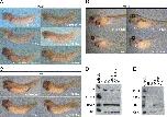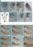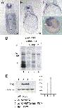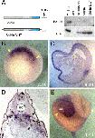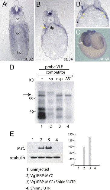 Supplementary Fig. S3. In situ hybridization for Vg1RBP expression in tailbudâtadpole stages embryos. (AâBâ²) In situ hybridization for Vg1RBP on progressive anterior to posterior sections of tailbudâtadpole stages embryos. (A) Transverse section of stage 32 embryo. (BâBâ²) Transverse section of stage 34 embryo. Arrow in (B) indicates Vg1RBP transcript in the dorsal mesodermal layer. (Bâ²) Detail of panel B. Open arrowheads indicate Vg1RBP transcript in the dorsal mesodermal layer. Abundant expression of Vg1RBP is detected in the neural tube, as previously described (Yaniv et al., 2003). (C) Whole-mount in situ hybridization for Vg1RBP on stage 44 Xenopus gut. Abbreviations: dp, dorsal pancreatic rudiment; gd, gastroduodenal cavity; hp, hepatic cavity; nc, notochord; nt, neural tube; pa, pancreas. (D) UV cross-linking assay using 32P-VLE RNA as probe and Xenopus embryo extracts. In the absence of competitor RNA (lane 1). Competitions were carried out with 100-fold excess of specific competitor (sp, unlabeled VLE; lane 2), non-specific competitor (nsp, polylinker of MT-pCS2+; lane 3), 10 μM AS1 (lane 4). Arrow indicates the 69-kDa Vg1RBP cross-linked protein complex (Deshler et al., 1998, Havin et al., 1998). (E) Shirin 3â²UTR influences Vg1RBP protein levels. Uninjected embryos (lane 1); embryos injected with either myc-tagged Vg1RBP RNA (lane 2), myc-tagged Vg1RBP RNA together with Shirin 3â²UTR RNA (lane 3), or Shirin 3â²UTR RNA alone (lane 4) into the vegetal pole. Embryos were harvested at tadpole stage and processed for Western blot analysis of myc-tagged Vg1RBP and α-tubulin. On the right, histogram presents the quantification by densitometry of the Western blot. Protein level of myc-tagged Vg1RBP is set to 100% (lane 2), relative increase of 40% is observed in the presence of Shirin 3â²UTR (lane 3). The values were normalized to α-tubulin. The average of three experiments shows a relative increase of 35% (data not shown).