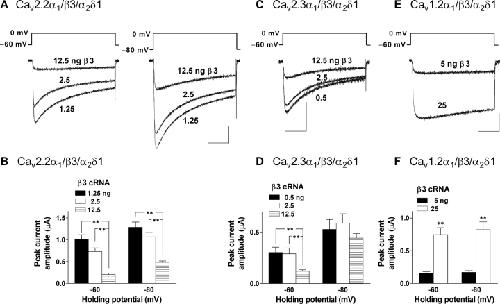 Figure 1. . The β3 subunit markedly suppressed the current amplitude of N-type (Cav2.2; A and B) and R-type (Cav2.3; C and D), but not L-type (Cav1.2; E and F) calcium channels at physiological HPs in Xenopus oocytes. For N- and R-type channels, cells were injected with cRNAs (cDNA for Cav2.3α1) encoding either Cav2.2α1 (2.5 ng/cell) or Cav2.3α1 (4.5 ng/cell) and α2δ1 (2.5 ng/cell) in combination with β3 (1.25, 2.5, or 12.5 ng/cell). Cells expressed L-type channels were injected with cRNA encoding Cav1.2α1 (5 ng/cell) and α2δ1 (12.5 ng/cell) in combination with β3 (5 or 25 ng /cell). Currents were evoked by a brief depolarization to 0 mV from HPs of â60 and â80 mV. (A, C, and E) Superimposed current traces of whole cell Ba2+ currents through the calcium channels. Bars, 0.5 μA and 50 ms. Residual capacitance transients after leak subtraction have been erased. (B, D, and F) Summary of the effects of the β3 subunit on the peak currents of N- (n = 9), R- (n = 7), and L-type (n = 4) calcium channels. Data are indicated as mean ± SE. Asterisks denote significant difference between any two groups in each set of experiments (**P < 0.01; one-way ANOVA with Bonferroni's multiple comparison test for B and D and unpaired t-test for F).