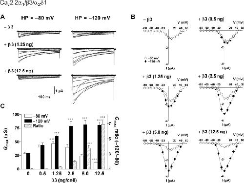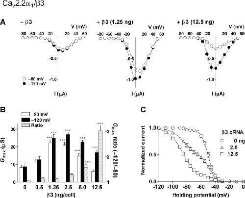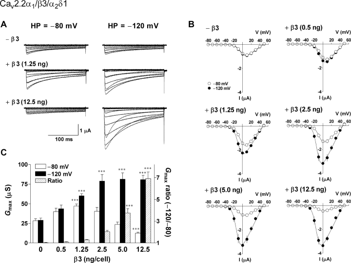 Figure 5. . The α2δ subunit was not essential for the β3 subunitâinduced inhibition of the N-type calcium channels. Oocytes were injected with cRNAs encoding Cav2.2α1 (2.5 ng/cell) in combination with various concentrations of β3. (A) I-V relationships for the peak Ba2+ currents at HPs of â80 (open circle) and â120 mV (closed circle). (B) Effects of the β3 subunit on the Gmax at different HPs. Gmax ratio (hatched column) was derived from Gmax at â80 (open column) and â120 mV (closed column). (C) Effect of the β3 subunit on steady-state inactivation. Inactivation midpoints (V1/2, inact) were calculated as follows: β3 0 ng (LVI and HVI), â66.7 and â49.8 mV; 2.5 ng, â84.2 and â48.6 mV; 12.5 ng, â85.7 and â44.3 mV. Proportions of LVI were as follows: β3 0 ng, 11.0%; 2.5 ng, 54.0%; 12.5 ng, 94.2%. Data are indicated as mean ± SE (A and B, n = 11 from 2 frogs; C, n = 4â8 from 2â4 frogs). Asterisks denote significant difference versus the control group without β3 (***P < 0.001).
