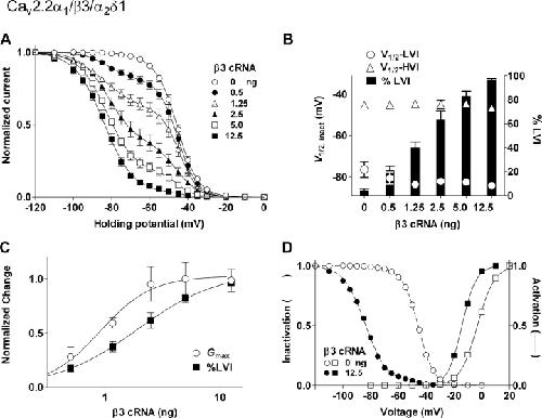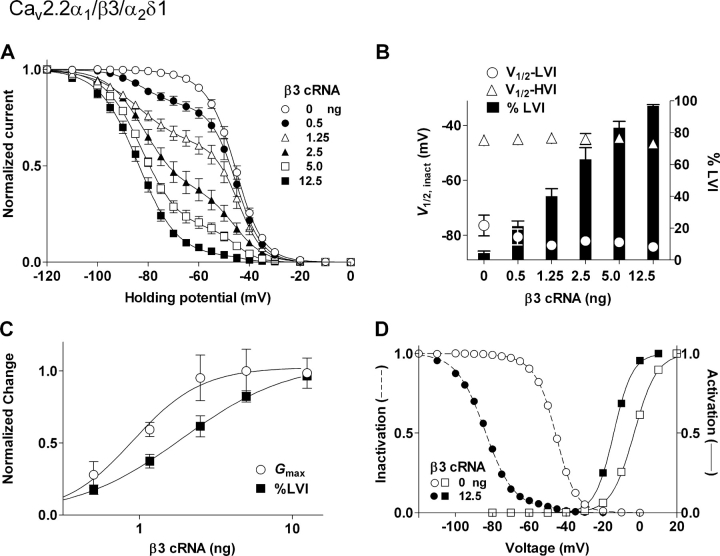 Figure 3. . The β3-induced hyperpolarizing shift of the steady-state inactivation curves of N-type calcium channels is attributed to change in the proportion of two components of the curves. Oocytes were injected with cRNAs as shown in Fig. 2. (A) Steady-state inactivation for HPs of 3-min duration. Data are indicated as mean ± SE (n = 7â15 from 3â7 frogs for each group). Note that HPs of 3 min did not induce maximal inactivation and therefore reflect âpseudo-steady-stateâ inactivation (compare Fig. 8). (B) Effects of the β3 subunit on inactivation midpoints (V1/2, inact) of LVI (open circle) and HVI (open triangle) and the proportion of LVI (%LVI; closed column). Plotted data were derived from the curve fitting in panel A and shown as mean ± SE. (C) Difference in concentration dependency of the β3-induced enhancement of Gmax and increase in the %LVI. Plotted data were derived from B and Fig. 2 C for %LVI and Gmax at a HP of â120 mV, respectively. Data were normalized by dividing each value by the maximum value and are expressed as mean ± SE. (D) No or little overlap of activation and inactivation curves seen in the presence or absence of β3. Plotted data were derived from panel A and Fig. 2 B.
