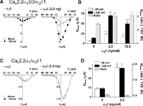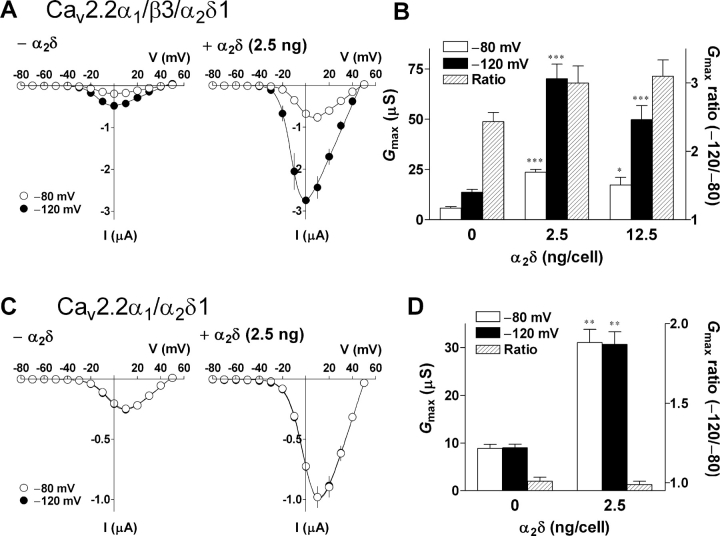 Figure 6. . The α2δ subunit markedly enhanced Gmax of the N-type calcium channels but had little or no effect on Gmax ratio. Oocytes were injected with cRNAs encoding Cav2.2α1 (2.5 ng/cell) in combination with α2δ (0, 2.5, or 12.5 ng/cell) in the presence (A and B) or absence (C and D) of the β3 subunit (2.5 ng/cell). (A and C) I-V relationships for the peak Ba2+ currents at HPs of â80 mV (open circle) and â120 mV (closed circle). (B and D) Effects of the α2δ subunit on Gmax at HPs of â80 (open column) and â120 mV (closed column) and Gmax ratio (hatched column). Data are indicated as mean ± SE (A and B, n = 5â6; C and D, n = 6 from 1 frog each). Asterisks denote significant difference versus the control group without β3 (*P < 0.05, **P < 0.01, ***P < 0.001).