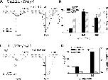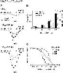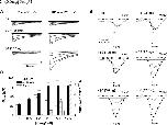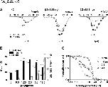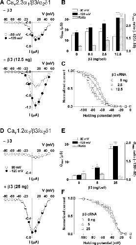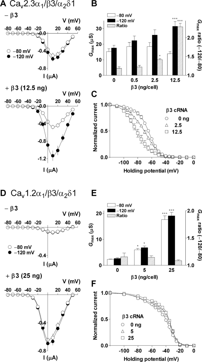 Figure 7. . Effects of the β3 subunit on R- (AâC) and L- (DâF) type calcium channels. For R-type channels, oocytes were injected with cRNA (cDNA for α1) encoding Cav2.3α1 (4.5 ng/cell) and α2δ (2.5 ng/cell) in combination with various concentrations of β3 (0, 0.5, 2.5 or 12.5 ng/cell). Cells expressing L-type channels were injected with cRNA encoding Cav1.2α1 (5 ng/cell), α2δ (12.5 ng/cell), and β3 (0, 5, or 25 ng/cell). (A and D) I-V relationships for the peak Ba2+ currents at HPs of â80 mV (open circle) and â120 mV (closed circle). (B and E) Effects of the β3 subunit on Gmax at different HPs. Gmax ratio (hatched column) was calculated from Gmax at â80 (open column) and â120 mV (closed column). (C and F) Effect of the β3 subunit on steady-state inactivation. Inactivation midpoints (V1/2, inact) were as follows: R-type/β3 0 ng (LVI and HVI), â94.7 and â63.3 mV; 2.5 ng, â89.5 and â64.7 mV; 12.5 ng, â86.5 and â58.5 mV; L-type/β3 0 ng (LVI and HVI), â65.3 and â35.0 mV; 5 ng, â67.1 and â32.8 mV; 25 ng, â64.2 and â33.0 mV. Proportion of LVI was as follows: R-type/β3 0 ng, 10.6%; 2.5 ng, 28.3%; 12.5 ng, 90.8%; L-type/β3 0 ng, 38.8%; 5 ng, 31.9%; 25 ng, 28.7%. Data are indicated as mean ± SE (A and B, n = 8 from 2 frogs; C, n = 4â7 from 2 frogs; D and E, n = 5 from 1 frog; F, n = 4 from 1 frog). Asterisks denote significant difference versus the control group without β3 (*P < 0.05, ***P < 0.001).