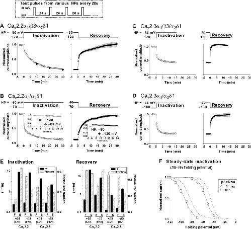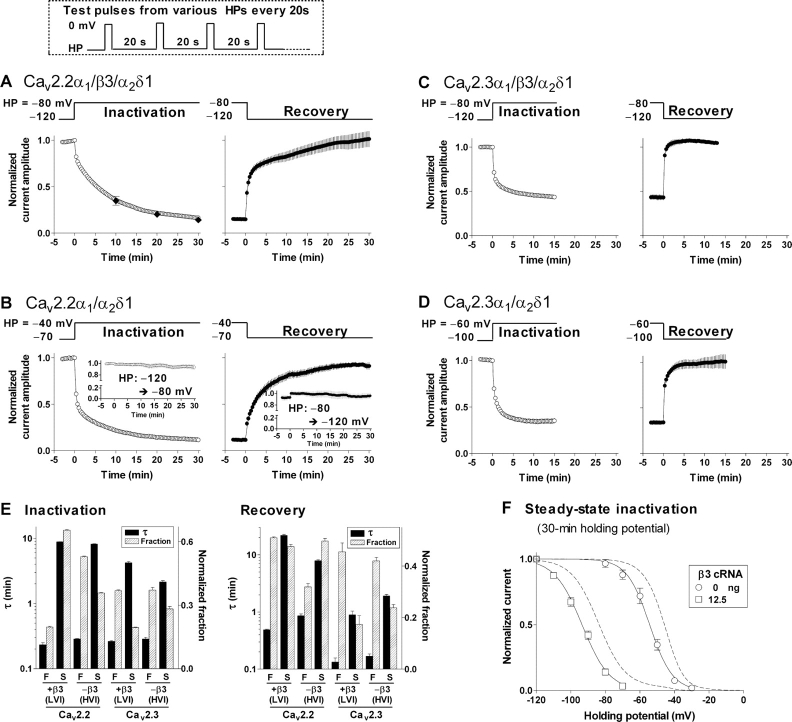 Figure 8. . Slow kinetics of the closed-state inactivation of N- and R-type calcium channels. Oocytes were injected with cRNAs (cDNA for Cav2.3α1) encoding either Cav2.2α1 (2.5 ng/cell) or Cav2.3α1 (4.5 ng/cell) and α2δ (2.5 ng/cell) in the absence or presence of β3 (12.5 ng/cell). The kinetics of the inactivation and the recovery from the inactivation were investigated by altering HPs as indicated in each panel (AâD). Kinetic curves were derived from peak currents elicited by repetitive test pulses (100 ms) to 0 mV every 20 s as shown in the top. (A and B) Inactivation kinetics of N-type calcium channels. Cav2.2α1 with (A) or without β3 (B) corresponds to LVI or HVI of the steady-state inactivation curve of N-type channels, respectively (see Fig. 3 A). Closed diamonds in A are inactivation kinetics when channel activity was tested every 10 min instead of at 20-s intervals (n = 4). Inserts in B are control experiments indicating stable channel activity during a whole experiment (n = 8). (C and D) Inactivation kinetics of R-type calcium channels. Cav2.3α1 with (C) or without β3 (D) corresponds to LVI or HVI of the steady-state inactivation curve of R-type channels, respectively (see Fig. 7 C). All the inactivation and recovery kinetic curves were fitted statistically better to a two-phase exponential than to a mono exponential function (F-test). (E) Time constants (Ï) and corresponding fractions for the kinetics of inactivation and recovery from the inactivation. F and S indicate a fast and a slow component, respectively. Data are indicated as mean ± SE (n = 4â6 from 2 frogs). (F) Steady-state inactivation with 30-min HPs. Broken lines show inactivation curves obtained with 3-min HPs for comparison (see Fig. 3 A). Each data point was obtained from individual oocytes and represents mean ± SE (n = 4â5 from 2â3 frogs).
