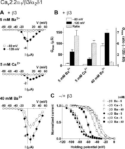 Figure 9. . Effects of different charge carriers (divalent cations) on the β3 subunit-induced inactivation of N-type calcium channels. Oocytes were injected with cRNAs encoding Cav2.2α1 (2.5 ng/cell), α2δ (2.5 ng/cell) and β3 (12.5 ng/cell). Recording was performed with a bath solution containing 5 or 40 mM Ba2+, or 5 mM Ca2+ as the charge carrier. (A) I-V relationships for the peak divalent cation currents at HPs of â80 (open circle) and â120 mV (closed circle). (B) Effects of the different charge carriers on Gmax at HPs of â80 (open column) and â120 mV (closed column) and Gmax ratio (hatched column). (C) Effects of the different charge carriers on steady-state inactivation. For simple comparison, inactivation midpoints (V1/2, inact) obtained with and without β3 were derived from a single Boltzmann equation: 5 mM Ba2+ (âβ3 and +β3), â47.3 and â85.4 mV; 5 mM Ca2+, â39.1 and â81.0 mV; 40 mM Ba2+, â35.5 and â62.0 mV. Data are indicated as mean ± SE (A and B, n = 7 from 2 frogs; C, n = 5â6 from 2â4 frogs).