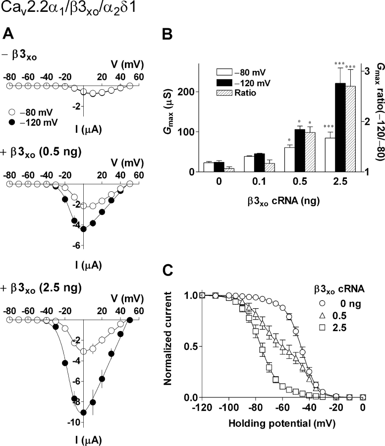 Figure 4. . The oocyte β3 (β3xo) subunit injected exogenously with N-type calcium channels modified channel properties similar to that observed for the rat β3 subunit. Oocytes were injected with cRNAs encoding Cav2.2α1 (2.5 ng/cell) and α2δ (2.5 ng/cell) subunits in combination with various concentrations of β3xo subunit (0, 0.1, 0.5, or 2.5 ng/cell). (A) I-V relationships for peak Ba2+ currents at HPs of â80 (open circle) and â120 mV (closed circle). (B) Effects of the β3xo subunit on the maximum conductance (Gmax) at HPs of â80 mV (open column) and â120 mV (closed column) and Gmax ratio (hatched column). (C) The β3xo caused a leftward shift of the steady-state inactivation curve. Inactivation midpoints (V1/2, inact) were as follows: β3xo 0 ng (LVI and HVI), â72.6 and â45.5 mV; 0.5 ng, â74.7 and â42.1 mV; 2.5 ng, â75.4 and â40.0 mV. Proportions of LVI were as follows: β3xo 0 ng, 7.6%; 0.5 ng, 55.7%; 2.5 ng, 96.0%. Data are indicated as mean ± SE (A and B, n = 5 from 1 frog; C, n = 5â6 from 2â3 frogs). Asterisks denote significant difference versus the control group without β3 (*P < 0.05, ***P < 0.001).
