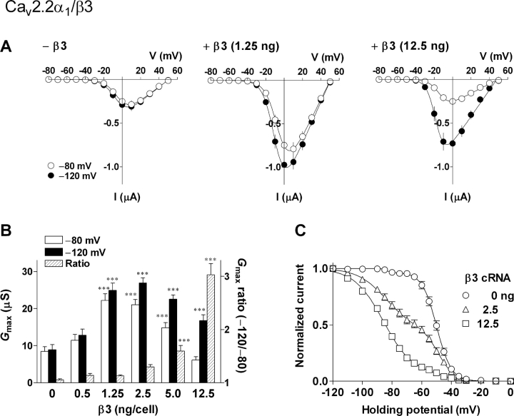 Figure 2. . The β3 subunit caused a biphasic effect on N-type calcium channels at a physiological HP. Oocytes were injected with cRNAs encoding Cav2.2α1 (2.5 ng/cell) and α2δ1 (2.5 ng/cell) in combination with various concentrations of β3 (0, 0.5, 1.25, 2.5, 5, or 12.5 ng/cell). (A) Examples of whole cell Ba2+ currents at HPs of â80 mV (left) and â120 mV (right). (B) Corresponding I-V relationships for peak Ba2+ currents at HPs of â80 (open circle) and â120 mV (closed circle). Activation midpoints (V1/2, act at the HPs of â80 and â120 mV) calculated from the Boltzmann fitting are: β3 0 ng, â2.7 and â3.0 mV; 0.5 ng, â3.4 and â5.8 mV; 1.25 ng, â4.1 and â8.5 mV; 2.5 ng, â5.9 and â12.4 mV; 5.0 ng, â6.8 and â13.3 mV; 12.5 ng, â10.7 and â14.7 mV, respectively. (C) Effects of the β3 subunit on the maximum conductance (Gmax) at the HPs of â80 (open column) and â120 mV (closed column) and the Gmax ratio (hatched column). Data are indicated as mean ± SE (n = 11â12 from two frogs). Asterisks denote significant difference versus the control group without β3 (***P < 0.001; one-way ANOVA with Dunnett's multiple comparison test).