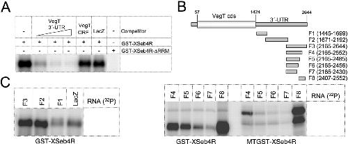 Figure 2. XSeb4R protein binds directly to the 3â²-UTR of VegT mRNA. (A) Bacterially purified GST-XSeb4R and GST-XSeb4RδRRM proteins were tested by UV-cross-linking assays for their ability to interact with full-length 32P-VegT mRNA. Unlabeled VegT 3â²-UTR, ORF, or LacZ mRNAs were used as competitors. (B) Schematic representation of the VegT 3â²-UTR subfragments tested by UV-cross-linking. The corresponding base pairs of the cDNA sequence (Acc. number: U59483) are indicated. (C) UV-cross-linking experiments of bacterially expressed, purified GST-XSeb4R or MT-GST-XSeb4R produced in embryos. Note that XSeb4R binds to multiple sites within the 3â²-UTR region of VegT mRNA.