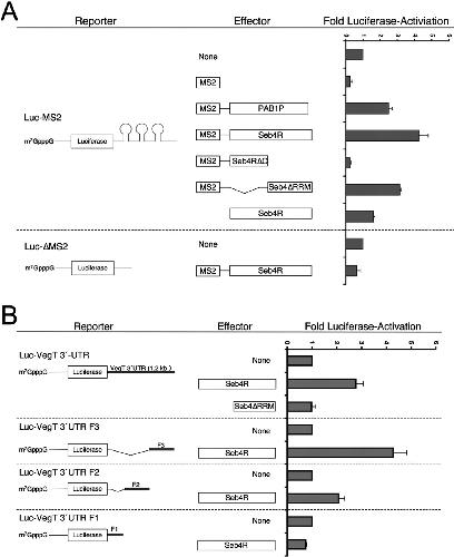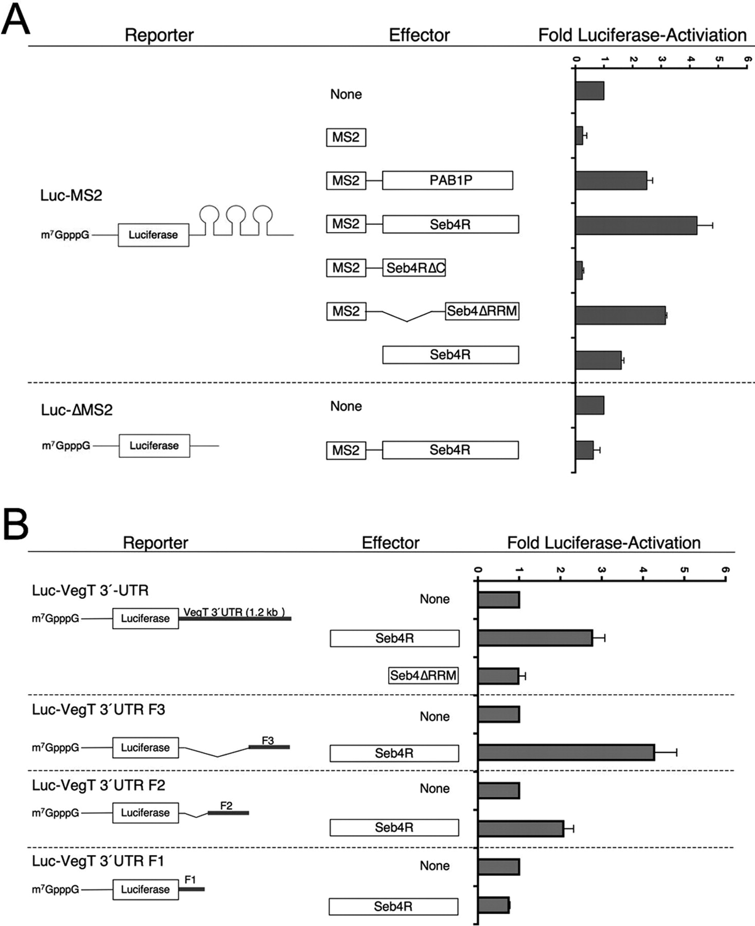Figure 3. XSeb4R stimulates translation. (A) A given protein can be targeted to a reporter mRNA harboring MS2-binding sites in its 3â²-UTR by fusion to the RNA-binding viral MS2 coat protein. Coinjection of synthetic mRNA encoding either MS2 fused to the full-length XSeb4R (MS2-XSeb4R), or a mutant version lacking the N-terminal RNA recognition motif (MS2-XSeb4RδRRM) together with a firefly luciferase reporter mRNA harboring three MS2-binding sites for (Luc-MS2) leads to robust luciferase activity in Xenopus oocytes. XSeb4R-MS2 lacking the C terminus, untethered XSeb4R, or MS2 alone fails to induce luciferase activity. Translational activation by MS2-PAB1P serves as positive control. MS2-XSeb4R does not activate a reporter construct lacking the MS2 recognition sites (Luc-δMS2). (B) Delineation of the VegT 3â²-UTR region required for translational activation through XSeb4R. The VegT 3â²-UTR and the indicated fragments were tested for conferring translational activation via XSeb4R in Xenopus oocytes. All firefly luciferase values were normalized to renilla luciferase; shown is the fold-activation relative to the Luc-MS2 or the Luc-VegT 3â²-UTR reporter activity alone