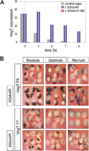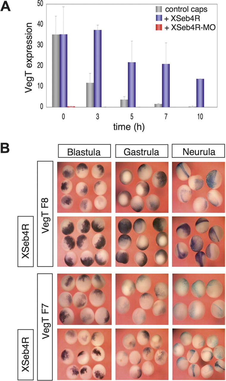 Figure 4. XSeb4R stabilizes its target mRNAs. (A) Real-time RTâPCR analysis of VegT transcripts in animal cap explants from embryos injected with XSeb4R mRNA, XSeb4R-MO, or control uninjected embryos collected at different time points after dissection. An average of 50 was employed per batch of animal cap explants. Note the significant increase or decrease of the VegT mRNA level in caps overexpressing XSeb4R or depleted of XSeb4R, respectively. Data are expressed in arbitrary units (A.U.). (B) XSeb4R overexpression causes persistent staining of a VegT 3â²-UTR fragment that strongly binds XSeb4R (VegT F8), but not of a fragment that does not do so (VegT F7). The indicated combinations of mRNAs were injected into the animal pole of one blastomere in two-cell stage albino embyos and batches of 20â25 embryos were fixed at various stages. The mRNA fragments of interest were traced by whole-mount in situ hybridization, using VegT antisense mRNA as a probe.