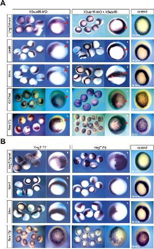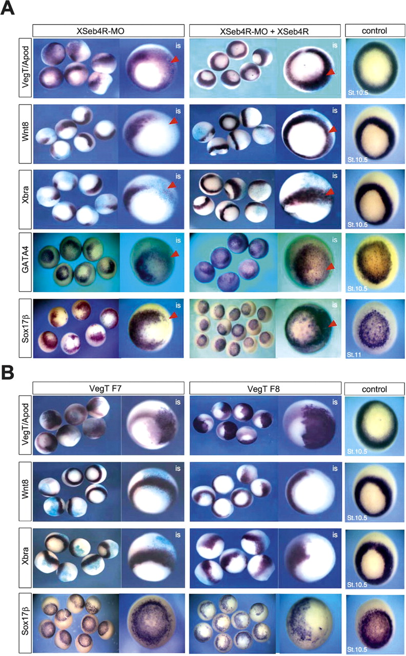 Figure 5. XSeb4R is required for endoderm formation and mesoderm induction. (A) XSeb4R knockdown decreases VegT mRNA and inhibits the expression of endoderm and mesodermal markers (100% inhibited, n = 41 for VegT, n = 28 for Wnt8, n = 31 for Xbra, n = 36 for GATA4, and n = 42 for Sox17β). XSeb4R-MO was injected into the marginal or the vegetal region of two blastomeres (50 ng each) from four-cell-stage embryos together with lacZ mRNA. Embryos were fixed at stage 11 and stained with Xgal (blue). For rescue, 150 pg of XSeb4R mRNA were used. Total rescue was obtained in 27 of 42 embryos for VegT, whereas only partial rescue was observed for Wnt8 (13 of 22) Xbra (20 of 34) Sox17β (36 of 42) and GATA4 (27 of 40). (B) A competing Seb4R-binding RNA fragment derived from the VegT 3â²-UTR (F8) inhibits mesodermal and endodermal gene expression. Embryos injected at the marginal or vegetal regions with 3 ng of VegT F8 or 4.5 ng of VegT F7 mRNA were fixed at gastrula stage 11 and analyzed by in situ hybridization for the indicated probes. The VegT probe detects the injected UTR fragments and the endogeneous transcripts. VegT F8 but not VegT F7 UTR injection causes significant suppression of the tested markers (Wnt8: VegT F8, 36 of 52; VegT F7, 19 of 57; Xbra: VegT F8, 34 of 46; VegT F7, 15 of 51; Sox17β: VegT F8, 32 of 40; VegT F7, eight of 34).