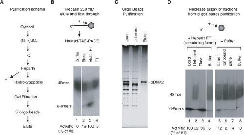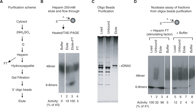 Figure 1. Purification and identification of the major 5′→3′ ssDNA exonuclease in Xenopus extracts. (A) Purification scheme. (B) Nuclease assay of the heparin flow through and 250 mM NaCl elute. The oligo substrate carried two 32P-labeled dA near the 3′-end and was attached to magnetic beads through a biotin at the 3′-end. After incubation at room temperature for 1 h, the reactions were terminated with 1% SDS, heated at 95°C for 5 min and then analyzed on an 8% TAE/PAGE. The 32P signal was detected by Phophoimager (Fuji). The nuclease activity was determined by calculating the fraction of small product generated (normalized to that of reaction 3 that contained both the 250 mM elute and the flow through). (C) A silver stained SDS–PAGE gel (4–12%) of the purified xDNA2 after the oligo beads purification. Load, proteins before binding to the oligo beads; unbound, proteins after incubation with beads; elute, bound proteins eluted by high salt buffer. (D) Nuclease assay of the purified xDNA2 in the presence of heparin flow through or buffer. The assay condition and the determination of the nuclease activity were similar to those in (B).