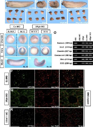 Figure 3. Ryk is essential for CE movements. (AâH) Overexpression or depletion of XRyk caused the disruption of CE movements. Two blastomeres of four-cell stage embryos were injected at the dorsal equatorial region with 500 pg XRyk mRNA, 40 ng XRyk MO, or 40 ng Co MO. (AâC) Compared with the Co MOâinjected embryos, embryos expressing XRyk mRNA or MO at stage 33 showed dorsal flexure and a failure to straighten the anteroposterior axis. (EâG) Keller sandwich explants from Co MOâinjected embryos elongated, but the explants expressing XRyk mRNA or MO were significantly inhibited. (D and H) Rescue of XRyk knockdown by coinjection of ORF XRyk mRNA. (IâO) XRyk did not affect mesodermal cell fate specification. (IâN) Whole mount in situ hybridization with Chordin, Xbra, and MyoD as probes. (O) RT-PCR analysis using primers specific for Siamois, Xnr3, Chordin, Goosecoid, and Xbra. ODC, ornithine decarboxylase, (a loading control); âRT, minus reverse transcription control sample. (PâR) XRyk or Wnt11 depletion inhibited the Dsh puncta colocalization with Rab5 in DMZ cells. 60 ng Wnt11 MO, 40 ng XRyk MO, or 40 ng Co MO was coinjected with GFP Dsh and myc Rab5 into the two dorsal blastomeres at the four-cell stage. DMZ explants were dissected at stage 11â11.5 and then subjected to fluorescence analysis. Bars, 20 μm.