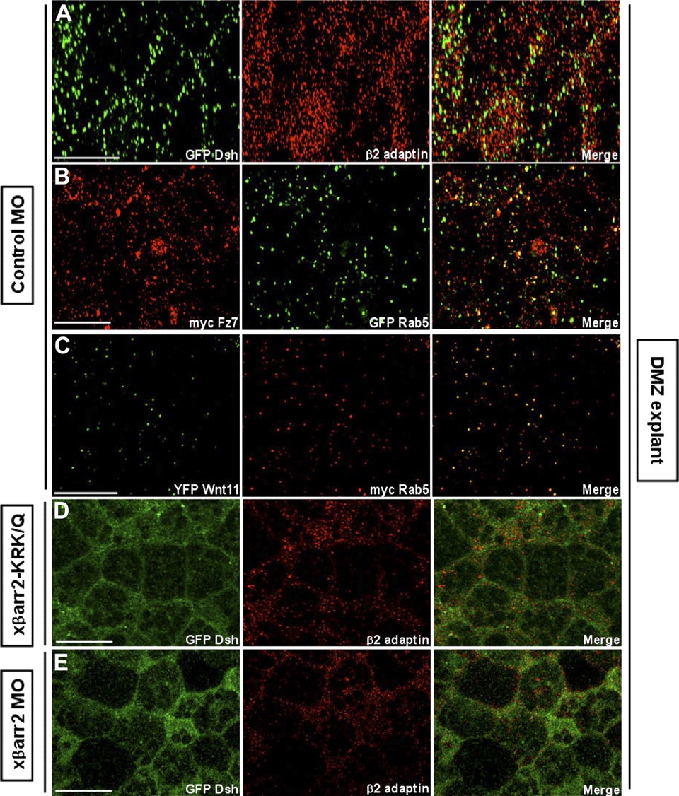 Figure 1. Endocytosis of Fz7 and Dsh occurs in X. laevis CE movements. Embryos were microinjected into the two dorsal blastomeres at the four-cell stage with a combination of the indicated mRNAs (500 pg GFP Dsh, 500 pg myc Fz7, 500 pg YFP Wnt11, 500 pg myc Rab5, 500 pg GFP Rab5, 1 ng xβarr2-KRK/Q, 10 ng xβarr2 MO, and 10 ng Co MO). DMZ explants were dissected at stage 11â11.5 and then subjected to fluorescence analysis. (A) Dsh localized to punctate structures that colocalize with β2 adaptin in DMZ tissues. (B and C) Fz7 and Wnt11 also overlapped with Rab5. (D and E) Functional knockdown of βarr2 by xβarr2 MO and xβarr2-KRK/Q relocalized Dsh to the cell membrane and inhibited colocalization with β2 adaptin in cytoplasm. Bars, 20 μm.