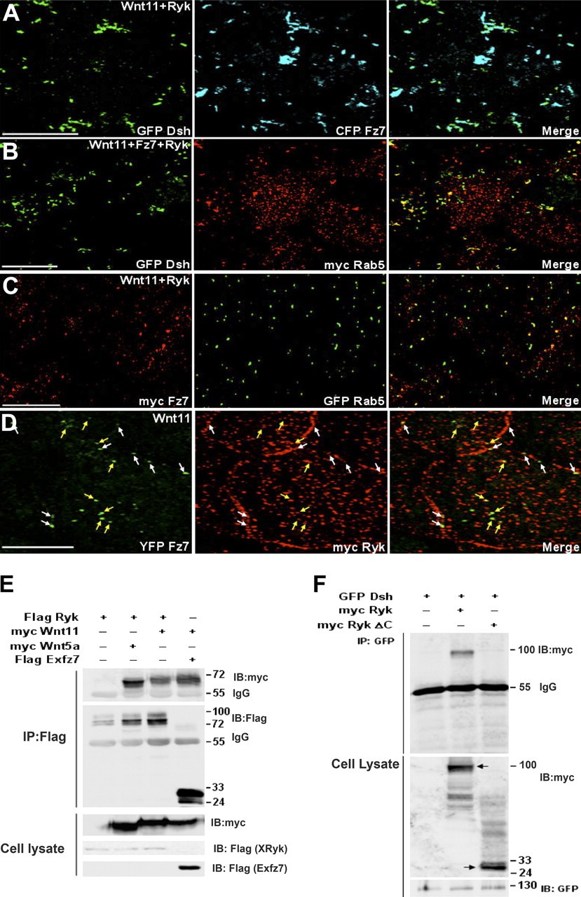 Figure 2. Ryk promotes internalization of the Wnt11-induced Fz7 and Dsh aggregates in animal cap cells. (AâD) Four-cell stage embryos were injected in the animal pole with various mRNAs in combination as indicated (500 pg GFP Dsh, 500 pg myc Rab5, 1 ng Fz7, 1 ng myc Fz7, 1 ng CFP Fz7, 1 ng YFP Fz7, 500 pg GFP Rab5, 1 ng XRyk, 1 ng myc XRyk, and 1 ng Wnt11). Animal caps were dissected at stage 9â10 and then subjected to fluorescence analysis. In the presence of Ryk, the Wnt11-induced punctate aggregates of Dsh and Fz7 (A) overlapped with Rab 5 (B and C). (D) Fz7 colocalized with Ryk in both cytoplasmic (yellow arrows) and membrane (white arrows) puncta. Bars, 20 μm. (E and F) HEK293FT cells were transfected with various constructs, either alone or in combination as indicated. Cell lysates were immunoprecipitated with anti-Flag (E) or anti-GFP (F) antibodies and the immunocomplexes were blotted with specific antibodies. (E) Ryk bound to the noncanonical Wnt11 as well as Wnt5a. (F) Ryk and Ryk-δC, which lacks the cytoplasmic domain, interacted with Dsh. Arrows indicate a size of epitope-tagged Ryk or Ryk-δC. Numbers to the right of the gel blots indicate molecular mass standards in kD.