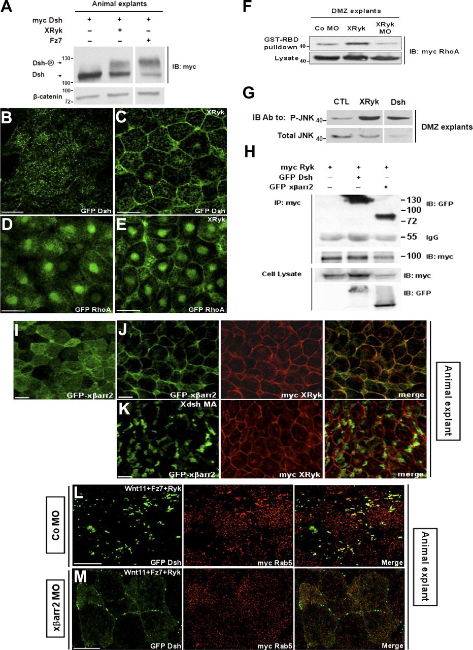 Figure 4. Ryk acts as an essential regulator of noncanonical Wnt signaling on CE movements. (A) Ryk, like Fz7, phosphorylated Dsh. Animal caps expressing myc Dsh (1 ng) alone or with the combinations of XRyk (1 ng) and Fz7 (1 ng) as indicated were subjected to Western blotting using anti-myc and antiâβ-catenin antibodies. (BâE) The normal Dsh (B) and RhoA (D) distribution was translocated by Ryk to the cell membrane in animal cap cells (C and E). XRyk (1 ng) were injected with GFP Dsh (500 pg) or GFP RhoA (500 pg) into the animal regions of embryos at the four-cell stage, either alone or in combination as indicated. (F and G) Two blastomeres of four-cell stage embryos were injected at the dorsal marginal region with the indicated mRNAs or MO (1 ng myc RhoA, 1 ng Dsh, 1 ng XRyk, and 40 ng XRyk MO). The DMZ explants were dissected at stage 10.25 and cultured until stage 12. (F) Ryk activated RhoA in DMZ tissues during gastrulation, but Ryk MO inactivated them. GTP-bound RhoA in DMZ lysates was precipitated using GST-RBD and visualized by immunoblotting with an anti-myc antibody. (G) Ryk, like Dsh, induced JNK phosphorylation in CE movements. The explant lysates were blotted with anti-phospho JNK and anti-JNK antibodies. (H) Ryk physically interacted with βarr2 in vivo. HEK293FT cells were transfected with myc XRyk, GFP xβarr2, or GFP Dsh, either alone or in combination as indicated. Cell lysates were immunoprecipitated with anti-myc antibody, and the immunocomplexes were blotted with specific antibodies. Numbers to the sides of the gel blots indicate molecular mass standards in kD. (IâM) Four-cell stage embryos were injected in the animal pole with various mRNA in combination as indicated (500 pg GFP xβarr2, 1 ng Xdsh MA, 1 ng, myc XRyk, 1 ng Wnt11, 1 ng Fz7, 500 pg GFP Dsh, 10 ng xβarr2 MO, 10 ng Co MO, and 500 pg myc Rab5). Animal caps were dissected at stage 9â10 and then subjected to fluorescence analysis. (I) Normal distribution of βarr2 in animal cap cells. (J and K) Ryk-induced membrane distribution of βarr2 was relocalized by Xdsh-MA to the intracellular cluster. (L and M) βarr2 knockdown inhibited the noncanonical Wnt11/Fz7-mediated Dsh endocytosis in the presence of Ryk. Bars, 20 μm.