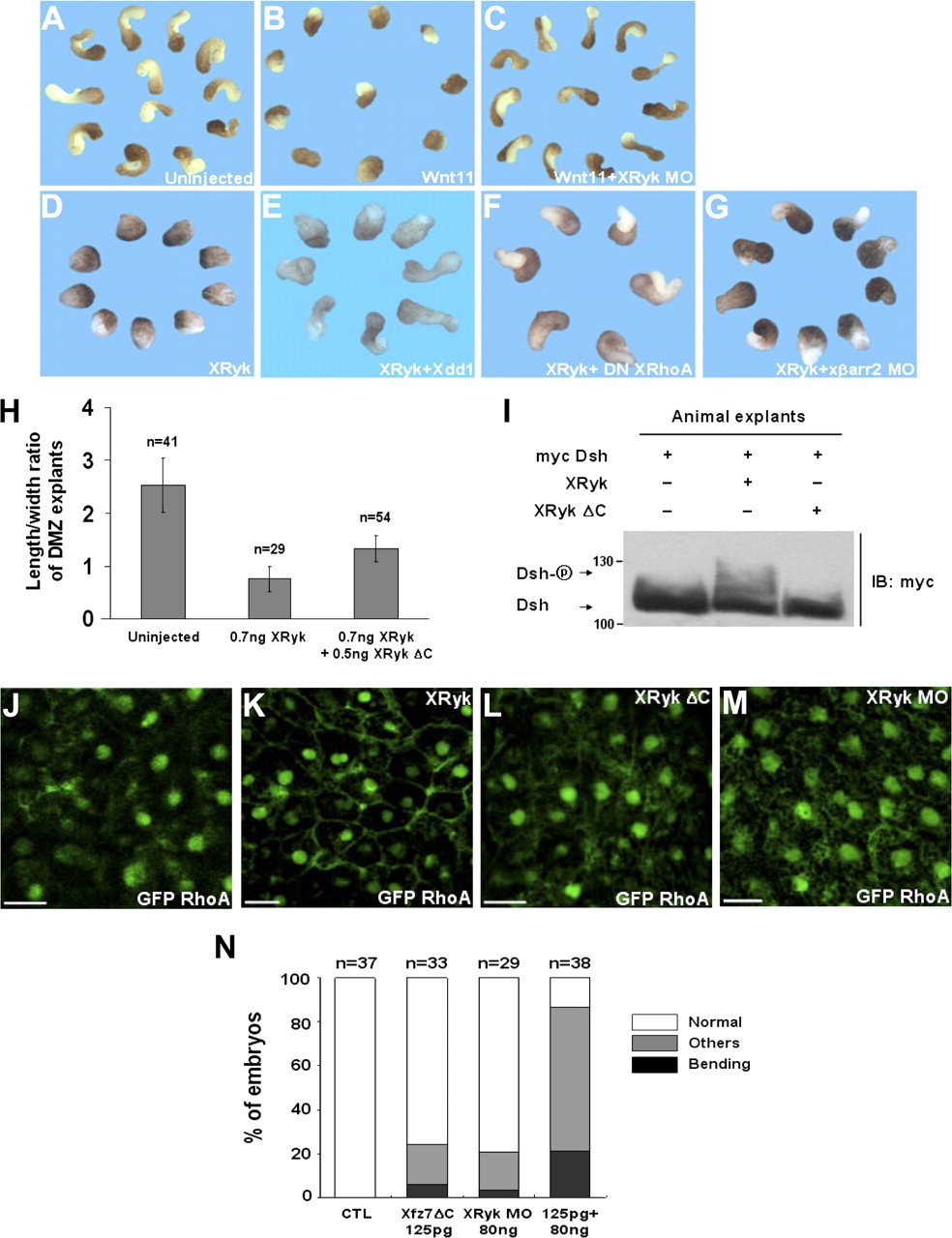 Figure 5. Ryk is required for Dsh to regulate the activation of noncanonical Wnt signaling. (AâG) Rescue assays between Ryk and noncanonical Wnt components. Two blastomeres of four-cell stage embryos were injected at the dorsal marginal region with the indicated reagents. Quantitative results of DMZ elongation assay are explained in Table S1 (available at http://www.jcb.org/cgi/content/full/jcb.200710188/DC1). (H) Quantitative assays of rescue between Ryk and Ryk δC in DMZ elongation assay. n, total number of explants. Error bars indicate the mean ± SD. (I) Ryk δC, unlike Ryk, did not phosphorylate Dsh. Animal caps expressing myc Dsh (1 ng) alone or with the combinations of XRyk (1 ng) and XRyk δC (1 ng), as indicated, were subjected to Western blotting using anti-myc. Numbers to the left of the gel blot indicate molecular mass standards in kD. (JâM) The normal RhoA distribution was not translocated by Ryk δC and Ryk MO to the cell membrane in animal cap cells. XRyk (1 ng), XRyk MO (80 ng), or XRyk δC (1 ng) were injected with GFP RhoA (500 pg) into the animal regions of embryos at the four-cell stage, either alone or in combination as indicated. Bar, 20 μm. (N) Ryk and Fz7 have a cooperative effect in CE movements. Others indicate a truncated and mild kinked axis. n, total number of embryos.