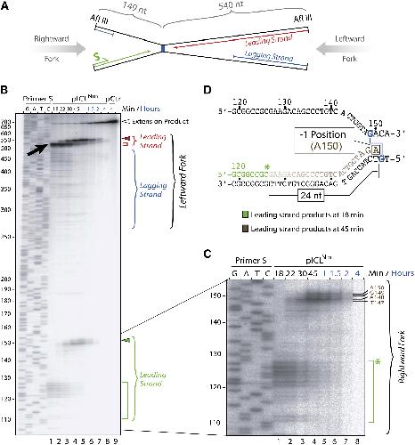 (B) Detection of nascent strands. pICLPt or pCtr was replicated in the presence (lanes 1 and 2) or absence (lanes 3 and 4) of 32P-α-dATP. After 4 hr, replication products were digested with AflIII and AseI, separated on a 5% denaturing polyacrylamide gel and transferred to a Nylon membrane. Radioactive products were visualized using a phophorimager.