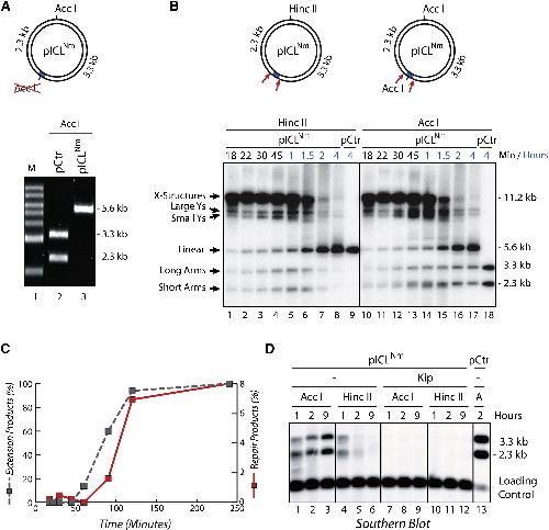 (B) pICLNm replication products were digested with HincII and separated on a native agarose gel (lanes 1–8). Replicated pCtr was digested with HincII to generate a 5.6 kb size marker (lane 9, only 20% of the reaction loaded).
