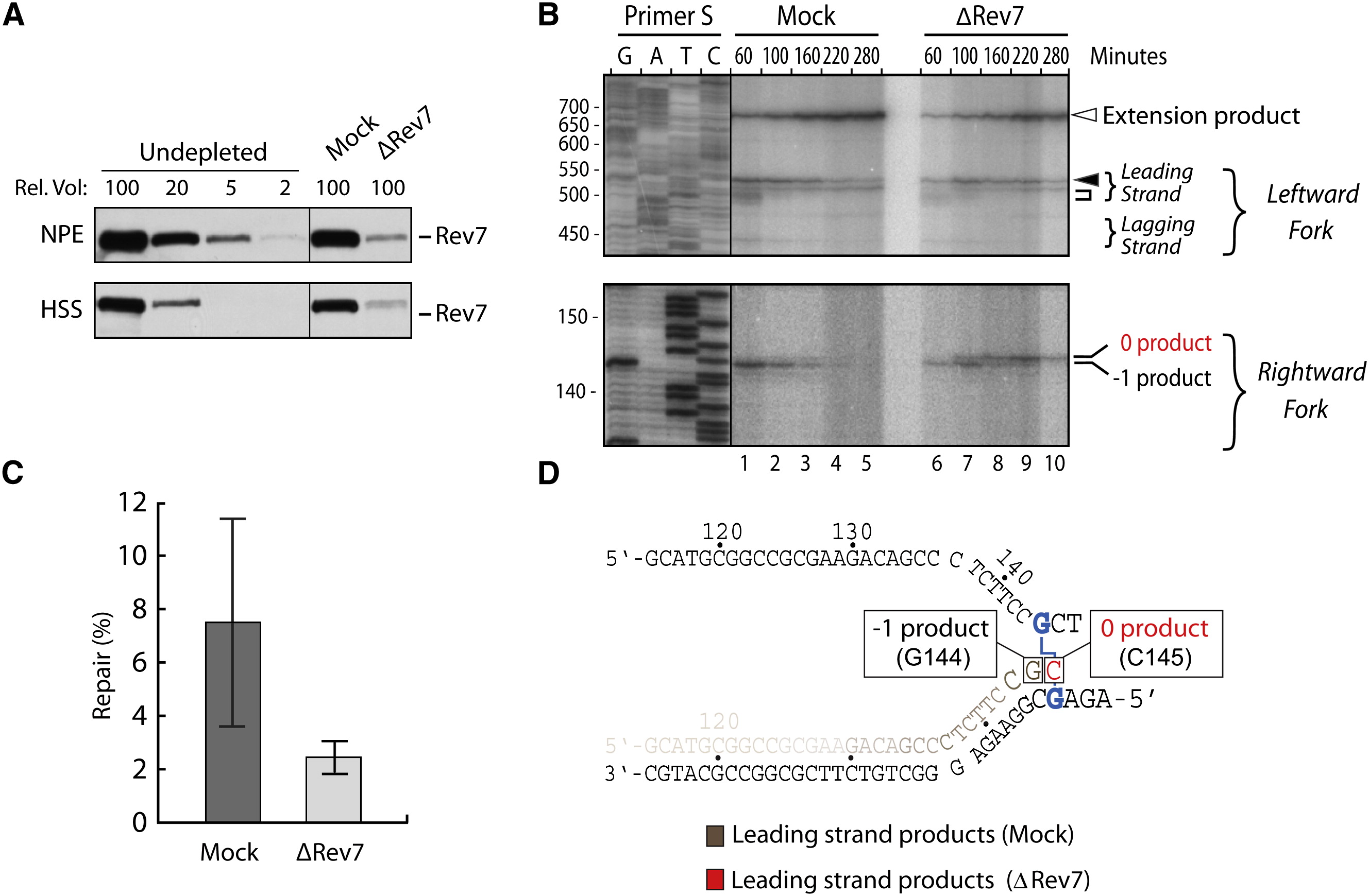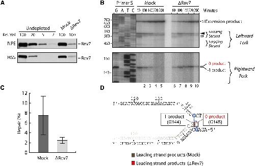 (A) Rev7 immunodepletion. Undepleted, mock-depleted, and Rev7-depleted HSS and NPE were analyzed by western blotting using Rev7 antibody. A relative volume of 100 corresponds to 0.3 μl extract.