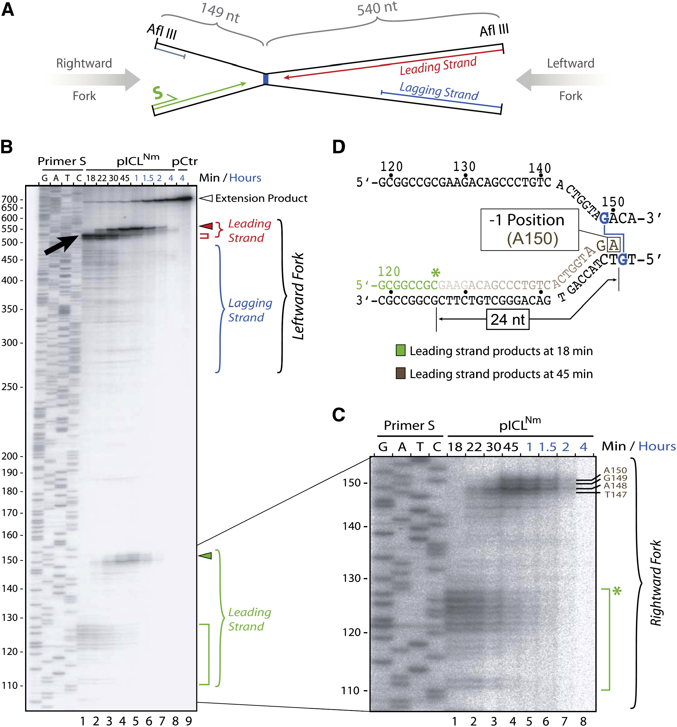 (B) Mapping of nascent strands during replication of pICLNm or pCtr (final concentration 1.2 ng/μl). At the indicated times after NPE addition, reaction products were digested with AflIII and analyzed on a sequencing gel alongside a sequencing ladder derived from extension of primer S on pCtr (see A). Numbers to the left indicate the sizes of the sequencing products. Leading and lagging strands for the rightward and leftward forks are indicated. Square brackets show the positions of leading strands after the initial pausing, whereas red and green arrowheads show their location after advancing toward the ICL. Open arrowhead, extension product.