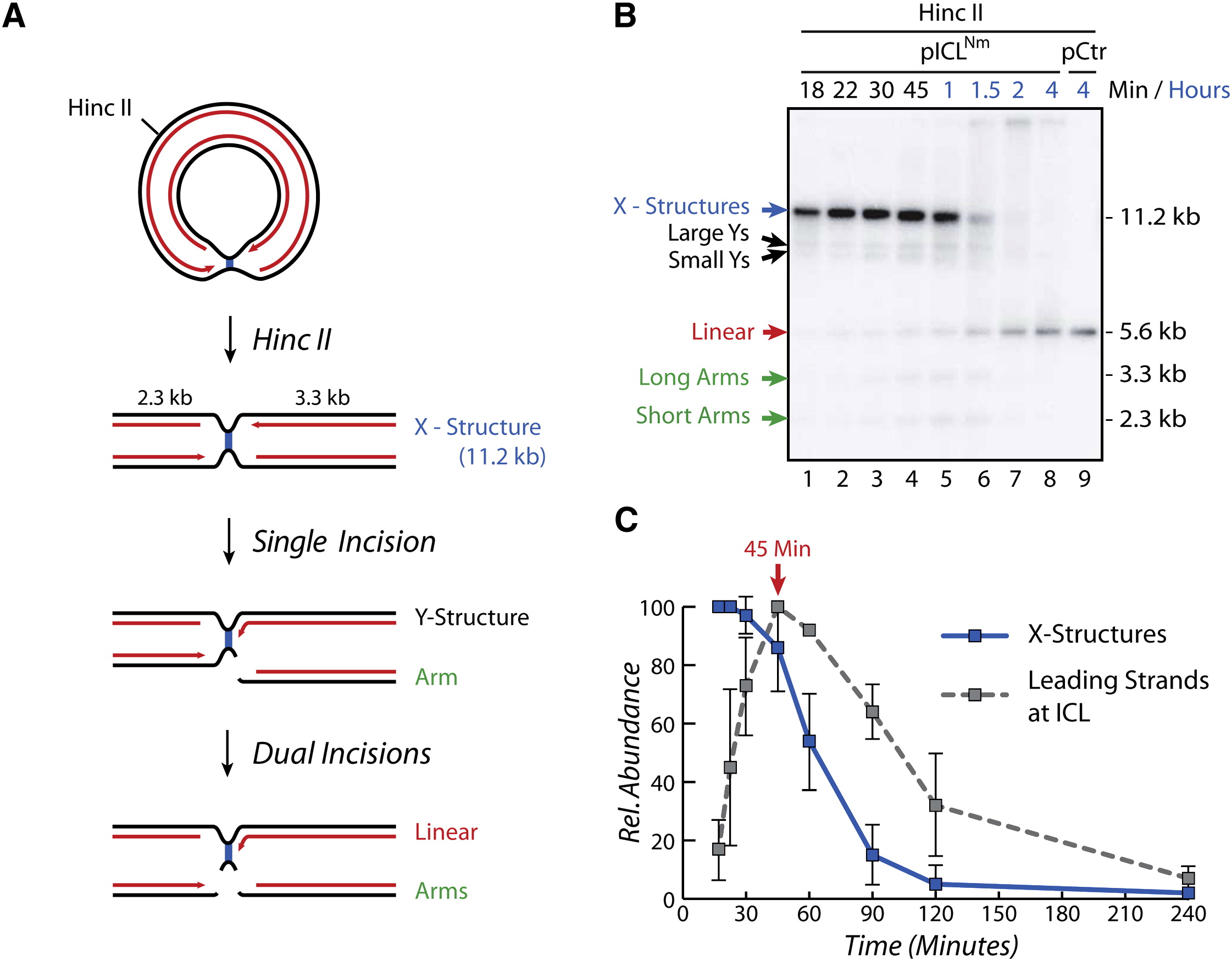 (A) Expected intermediates resulting from single or dual incisions near the ICL (see text). Note that the first incision could also occur to the left of the ICL, giving rise to a short arm and large Y structure.