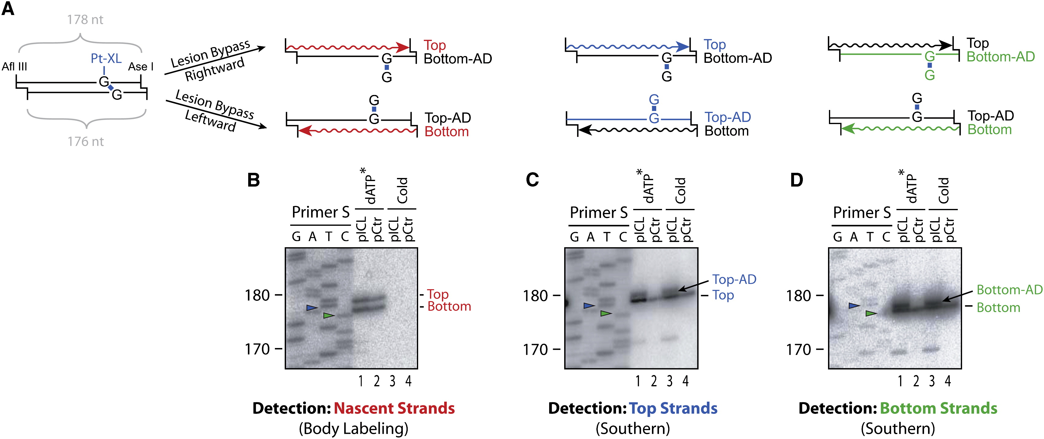 (A) Cartoon illustrating replication of an AflIII/AseI restriction fragment harboring a cisplatin ICL. Due to the different overhangs generated by these enzymes, digestion of pICLPt yields top and bottom strands of 178 and 176 nt, respectively. Lesion bypass by the rightward fork yields a radioactively labeled nascent top strand and an adducted, parental bottom strand (Bottom-AD), while lesion bypass by the leftward fork results in a labeled nascent bottom strand and an adducted parental top strand (Top-AD). Strand-specific Southern blotting was used to detect either the top strands (blue lines) or the bottom strands (green lines).