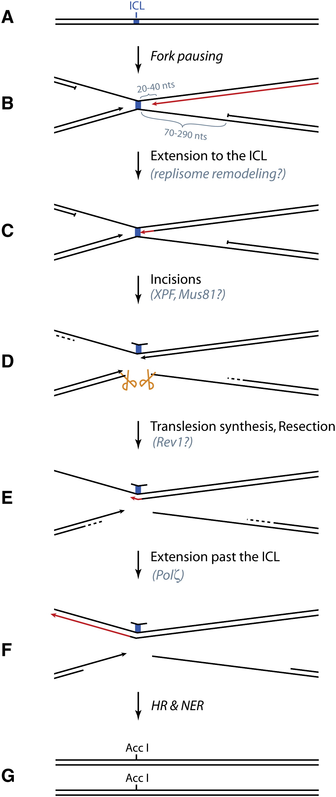 When DNA containing an ICL (A) undergoes DNA replication, the leading strands of two converging replication forks initially stall 20–40 nt from the lesion (B). One leading strand (indicated in red) is then extended to within 1 nt of the ICL, a step which may require prior replisome remodeling (C). Subsequently, the two sister chromatids are uncoupled via dual incisions (yellow scissors) on either side of the ICL, possibly by XPF and/or Mus81 (D). Next, a translesion DNA polymerase (possibly Rev1) inserts a nucleotide across from the adducted base (E), after which DNA polymerase ζ extends the nascent strand beyond the ICL (F). Finally, two fully repaired DNA duplexes are generated through the action of nucleotide excision repair (NER) on the top duplex and homologous recombination (HR) on the bottom duplex (G).