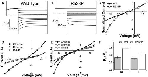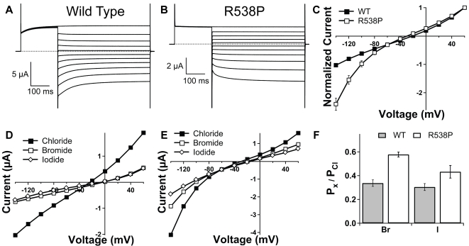 Figure 2. Gating and selectivity of ClC-Kb-R538P.Two-electrode voltage clamp recordings of (A) wild type and (B) R538P ClC-Kb channels. Currents are in response to a 200-ms prepulse to +60 mV followed by 500-ms test pulses ranging from +60 mV to −140 mV in −20 mV decrements. (C) Steady-state currents at the different voltages were normalized to the current value at +60 mV for wild type (filled squares) and R538P (open squares). Error bars are s.e.m. with n = 8 (WT) and n = 6 (R538P). Error bars smaller than the symbols are not shown. Representative steady state I–V curves for (D) wild type and (E) R538P channels in the presence of chloride (filled squares), bromide (open squares), or iodide (open diamonds). (F) Permeability ratios relative to chloride for wild type (filled bars) and R538P (open bars). The bromide/chloride permeability ratio of R538P is statistically different from that of wild type (p<0.0005, n = 5).